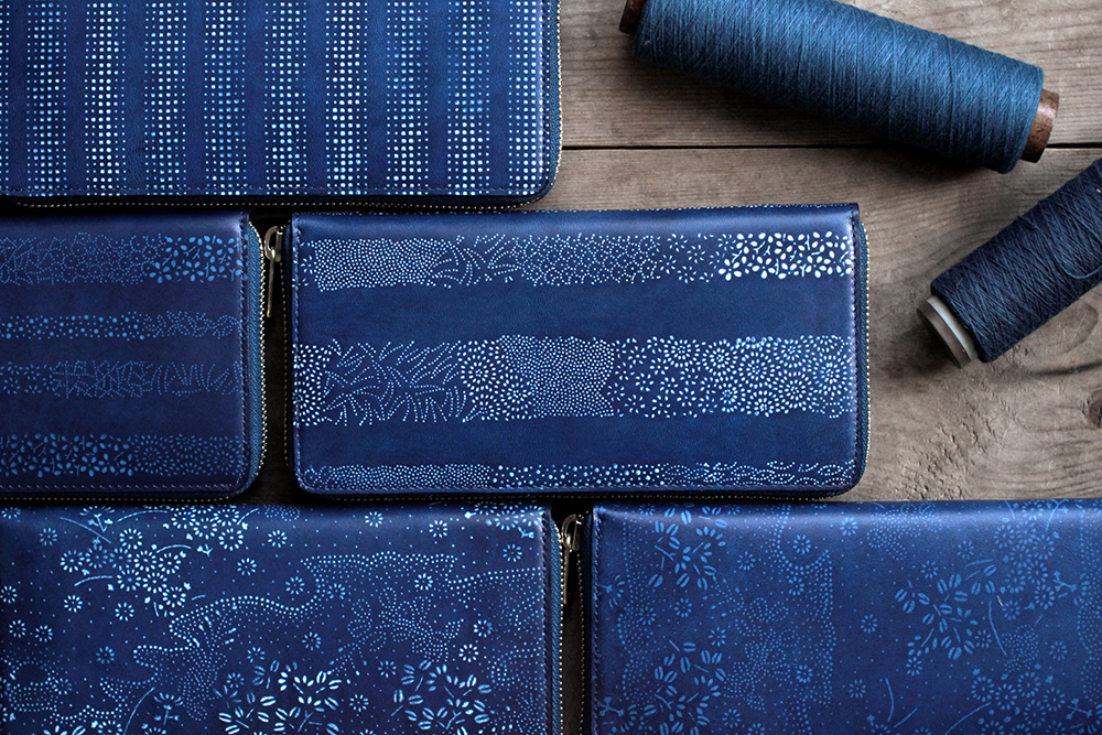 Mr . Harada is expressing indigo dyed leather in various ways such as bridle leather, gradation dyeing and stencil dyeing using rice bran and sticky rice glue. Expertise and experience are required because the nuances of indigo dyeing depend on the temperature and the humidity as well as the difference in materials. The dyed leather is made into products such as wallets and coin cases by Mr. Harada himself and they are sent out to the world one at a time.