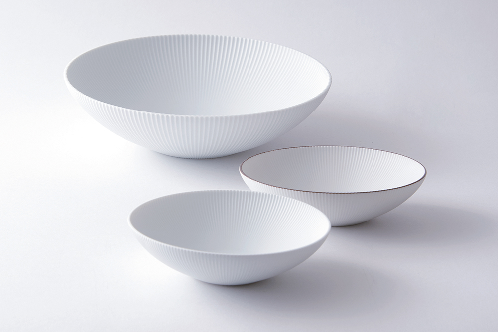 The traditional Sometsuke style products which are white porcelain painted in blue with a cobalt pigment called gosu serve as the main items of Riso Porcelain. Inherited traditional styles such as Ko-imari are made by skilled artisans one by one. On the other hand, for the “Shinogi” series which was designed for daily use, the company adopted the latest digital technology while referencing a traditional scraping technique called shinogite which creates ridge lines on the surface making it easy to hold in hand. Having a small and highly capable set up which is a structure that they have maintained since the founding, Riso Porcelain is continuing to produce a wide range of tableware in the traditional Sometsuke style, as well as creating modern and innovative designs. Their products are acknowledged as being well-designed and made with highly skilled techniques and this has led to collaborations with famous chefs and restaurants. Riso Porcelain is always thinking about the relationship between porcelain and food and they constantly challenge themselves to attain higher standards.