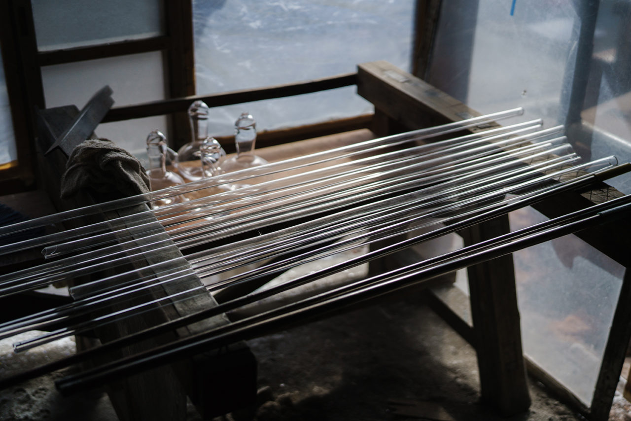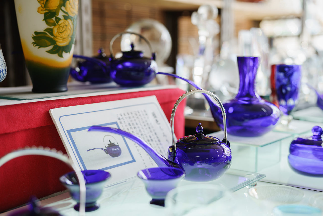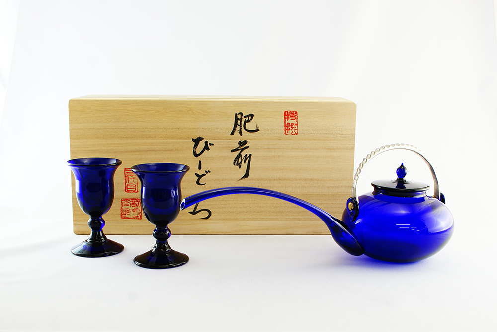 Soejima Glassware features free-blowing which is a glass forming style characterized by exhaling air into a molten portion of glass without using any mold and the method is designated as an important intangible cultural heritage of Saga Prefecture. Also, the forming technique called “Japan blowing” using two blow pipes is a skilled technique which requires more than 10 years to master. Soejima Glassware is the only manufacturer that inherited this technique and the “Hizen Kanbin”, a bottle for warming up sake, is a popular product that is made by using this technique.
