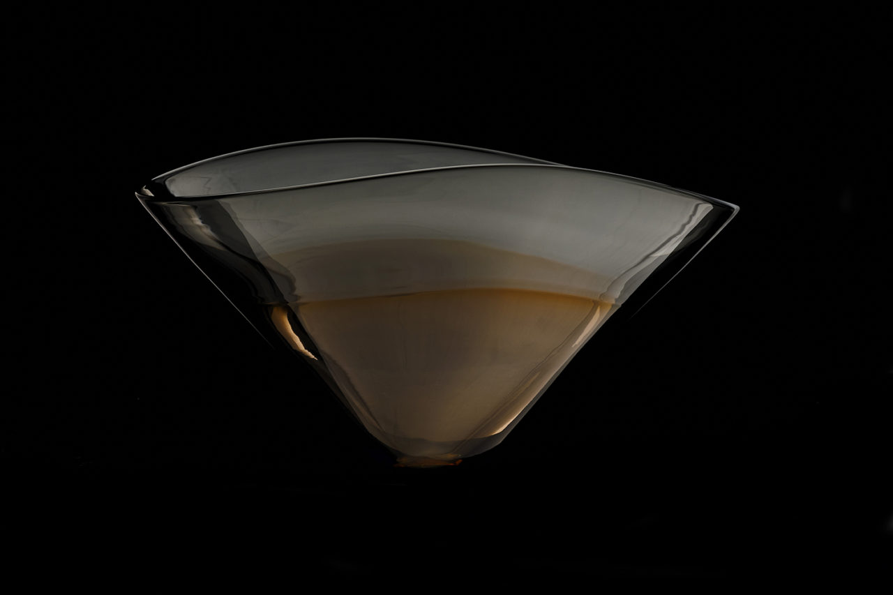 A hand-blown glass object in which light amber and gray layer over gentle curves. The hues which exude nostalgia, glimmer beautifully through the soft light. A work that creates a mysterious beauty that makes you lose track of time while falling in love with it.