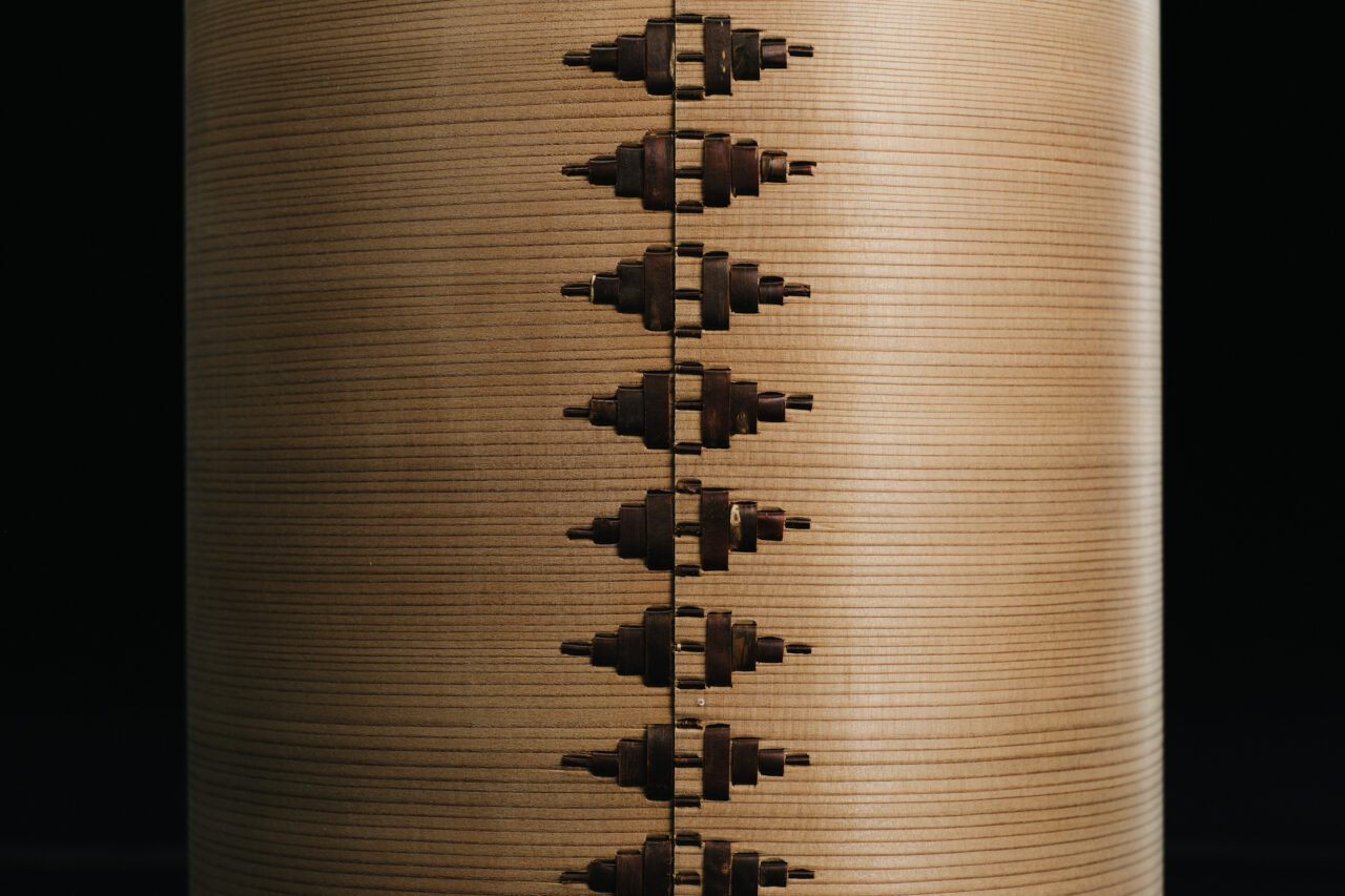 This champagne cooler, with its beautifully uniform and fine grain nurtured by the natural environment of northern Japan, is crafted from a 200 year-old Akita cedar, a rare and precious tree. The vertical grain boards, which provide excellent in flexibility and strength, are softened in boiling water and then bent into a cylindrical shape before being finished. The binding, sewn with mountain cherry bark, is decorated with a scale design meant to ward off evil spirits. The plain wood of this exquisite piece gives off a subtle fragrance every time it is used, making it a delightful item.