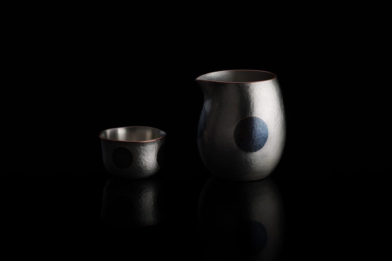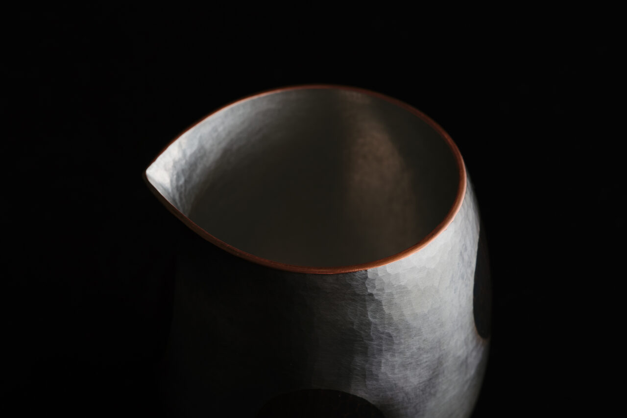 This sake cup has a rounded shape with a fine hammered pattern and lightly dancing polka dots. The thinly finished copper texture is cool and pleasant to the lips. This is a piece created by a skilled artisan using an array of different tools to finish a single sheet of copper plate, raising and planishing it, the sound of the hammer ringing out tens of thousands of times. It will continue to count time with its users for a long time to come.