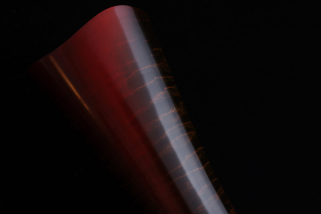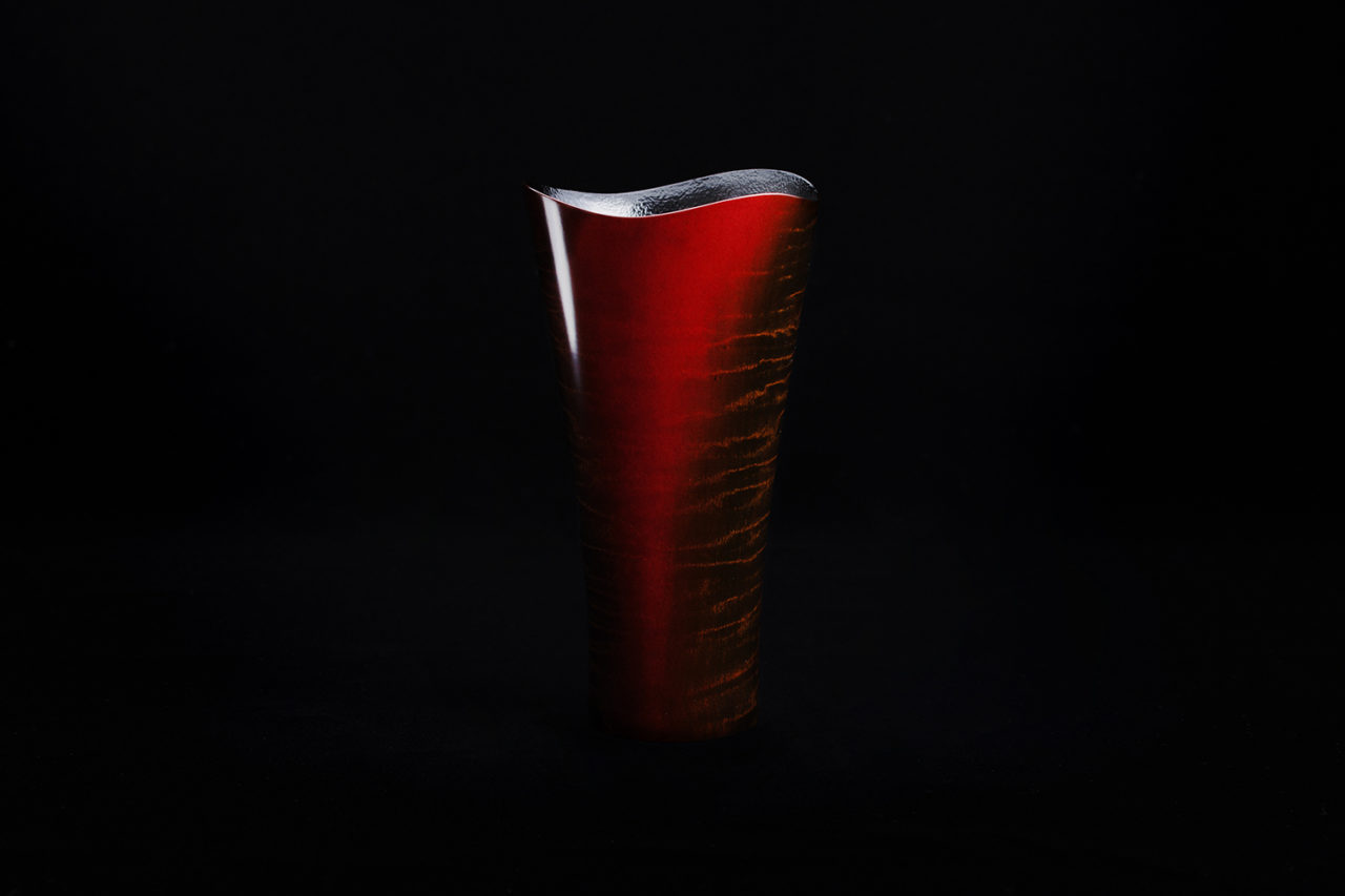 The traditional lacquerware craft inherited in the Yamanaka area has been given an alluring attire by one female woodturning artisan. The smooth curve shape dressed in lacquer emanates an added beauty. The colorful world of the intermingling of the grain from the horse chestnut wood and vermillion create endless possibilities.