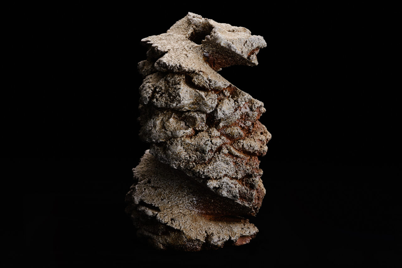 While inheriting his grandfather’s kiln as a potter and cherishing the lifestyle rooted in Bizen, Taiga Mori continues to challenge himself to develop new methods of expression. As the original name of this work, “Gaki Gaki Guru Guru,” suggests, he focused on using the sand and stones contained in the soil, rather than the clayey soil often used in Bizen, and created the spiral shape using wire, a new technique not available in the old Bizen era.