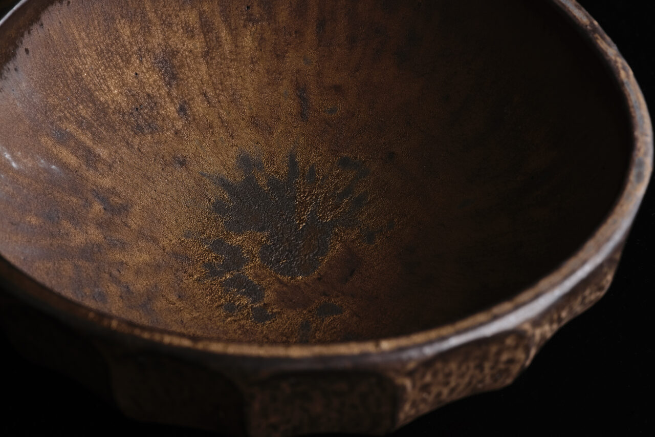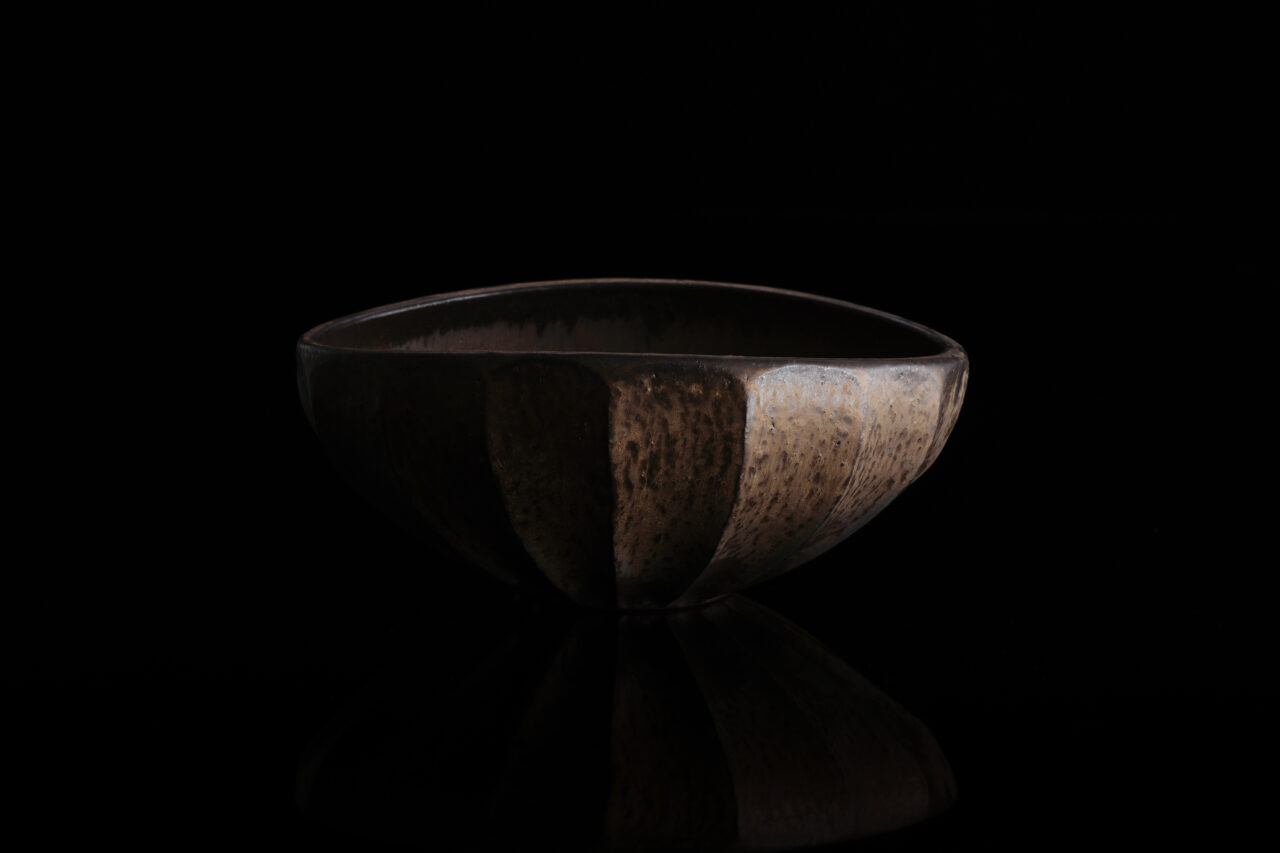 Hideki, an admirer of Lucie Rie’s works and a student of Shiro Banura, developed the black glaze “gen-yu”, which has become a signature of his, during the course of his research into Rie’s glazing style. The gilded glaze used in this work is an adaptation of that glaze with a coloration closer to gold. The carefully faceted shape (known as mentori in Japanese) and glowing bronze-like tone of the glaze have a subtle elegance, and a fascinating complex texture that exists between smoothness and roughness. The simple and modest, yet imposing appearance of this bowl is a picture in itself. Hideki’s works, however, follow the spirit of his master who loved dishware, always making us vividly imagine what they will look like when they are used to serve special cuisine. The true value of this work appears most clearly in the moment of enjoying food.