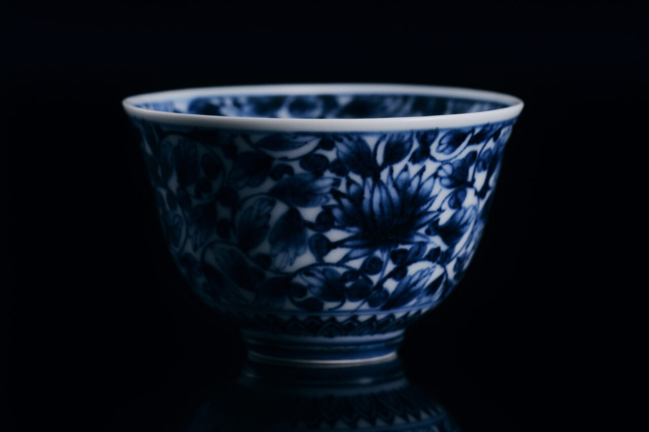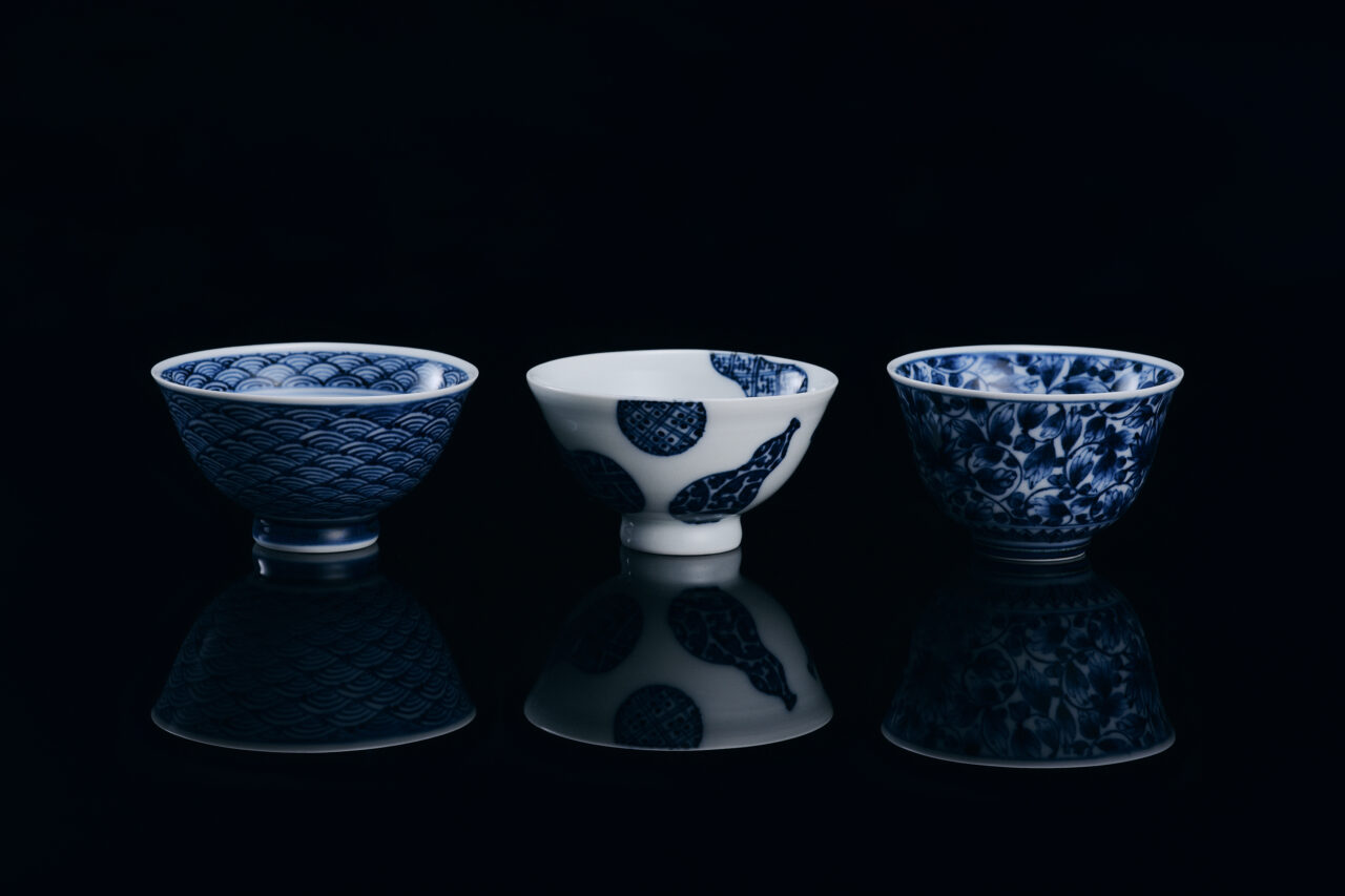 The cup bodies are thrown on a potter’s wheel. The porcelain body is made so thin and even that the exterior motifs appear to faintly show through from within. Each cup features an auspicious pattern long appreciated in Japan: the orderly geometry of seigaiha (literally, “blue ocean waves”), the light and playful contrast of white and indigo in the gourd motif, and the refined depth of the hana-karakusa (floral arabesque). These designs demonstrate a remarkably accomplished range of expression achieved through the sometsuke technique. On the well-balanced white porcelain, the supple lines and subtle tonal variations of gosu cobalt pigment reveal a level of skill that speaks to the assured craftsmanship of the two artists. Every cup carries a quiet appeal that naturally invites it to be held and used.