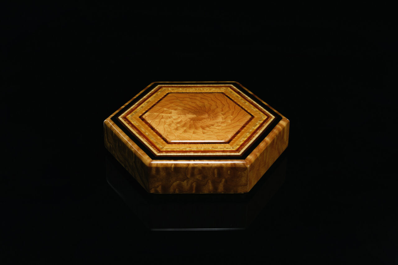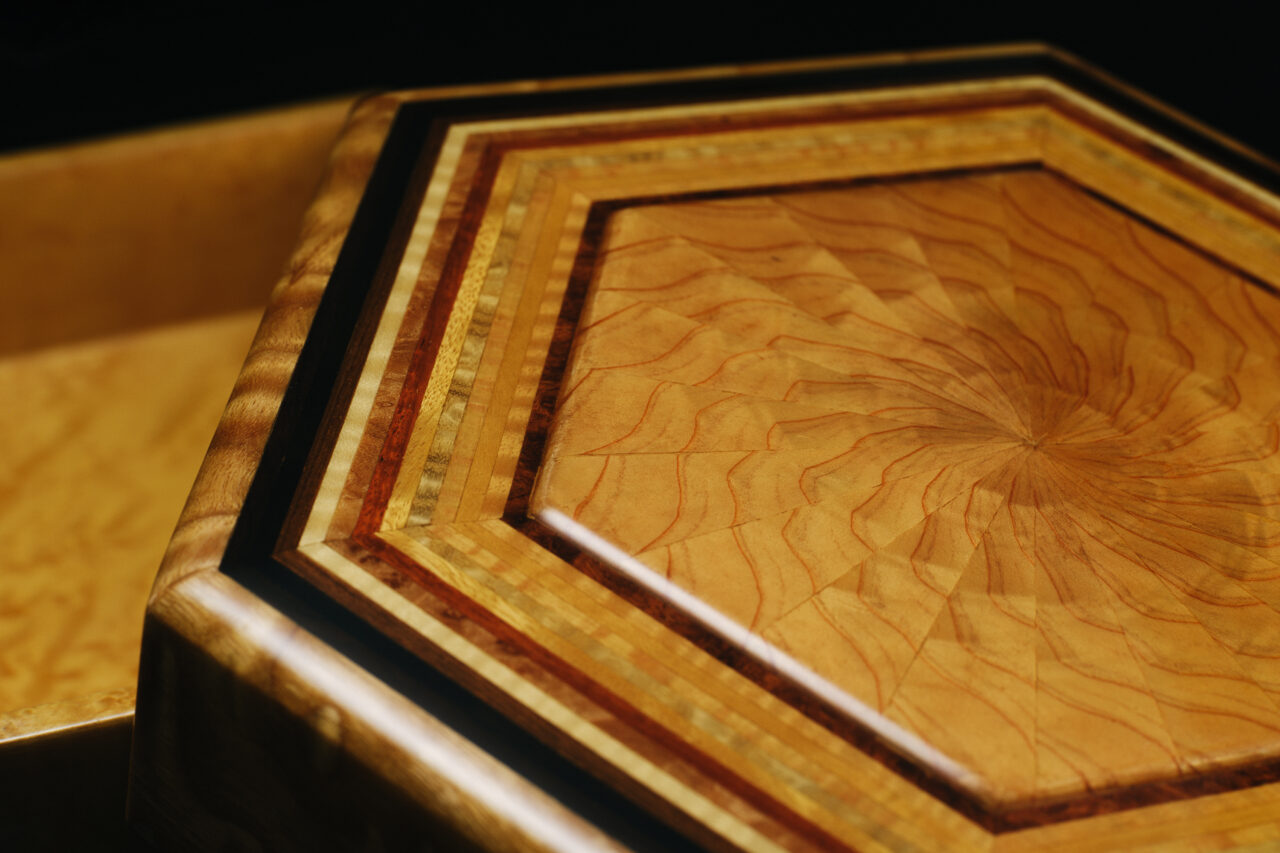 A veneer of Japanese cedar nemoku, or root burl, is radiantly arranged in a radial pattern at the center of the lid, creating an appearance of light swirling outwards from the center in concert with the evenly distributed grain patterns. Surrounding that are eleven different types of colorful and distinctive tsuki-ita veneers, precisely cut and placed without gaps. The lid is adorned with a three-dimensional hexagonal border, with smooth rounded corners characteristic of the unique woodworking techniques of Tokushima, which are rarely seen today. After the shape is constructed, the veneers are carefully affixed with nikawa (gelatin glue) using a tool similar to a small iron. This masterpiece showcases the mastery of an artisan who has perfected the art of working with tsuki-ita, as evidenced by its shining finish achieved through repeated layers of coating and polishing.