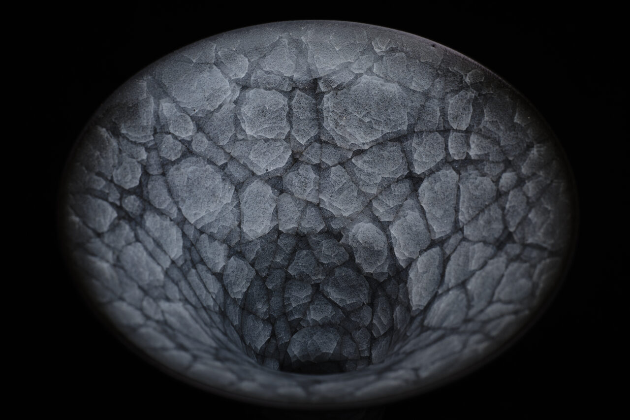 There is a dignified sense of calm tension in this “Ice Crackle Patterned Vase,” a creation of Takeshi Imaizumi, an artist who specializes in Tenmoku (black glazed tea bowls) and celadon ware. The thickly applied glaze shows through the smooth black clay, giving the piece a refined, glossy light black color. The delicate layers of intricate kan-nyu (crackle) give the piece a sense of infinite depth, so absorbing that I feel almost pulled in by its appearance. As the name “Ice Crackle Pattern” implies, the work presents a tranquil world of colorless colors, as if it has trapped a moment of ice cracking.
