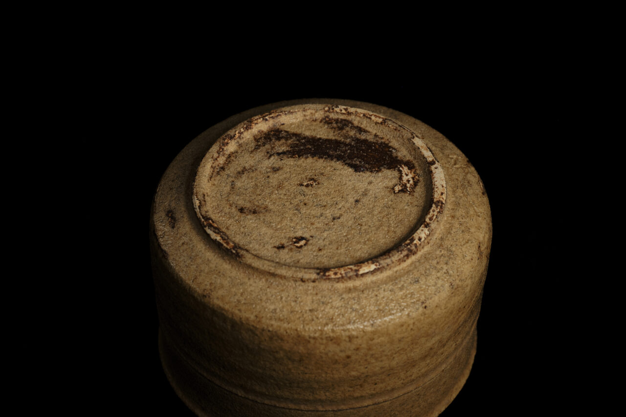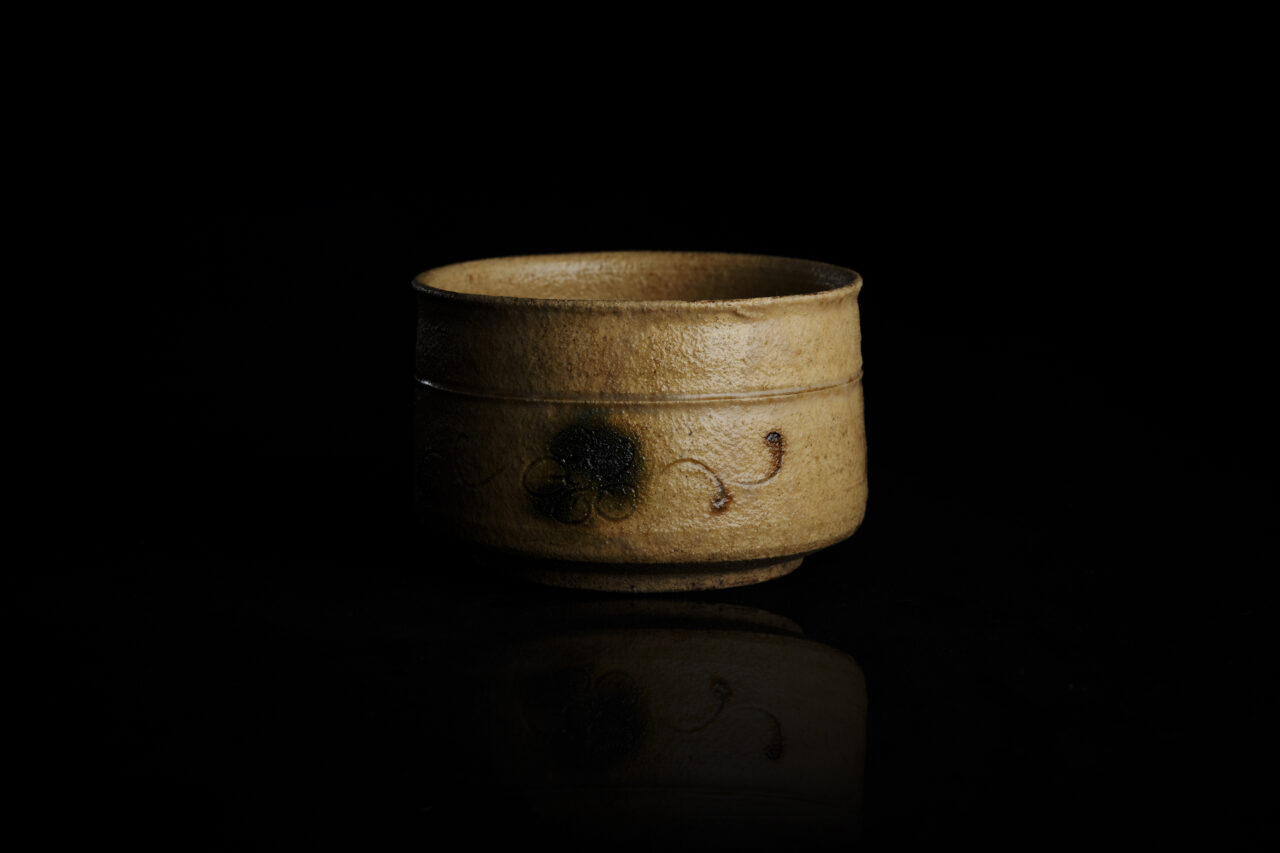 The gentle pale yellow surface of this tea bowl calls to mind a piece of abura-age, a kind of soft fried tofu, and indeed is often called “aburage-de” – an ideal expression for this “Ki-Seto Tea Bowl” by Yu Nishioka. With its thin base, thinly applied glaze, softly splashed green of the modest decorative “tanpan” green copper, and koge scorch marks visible on the kodai (foot) of the bowl as proof that it has been well fired, this exquisite bowl has a well-balanced beauty.