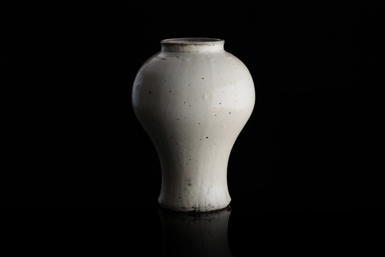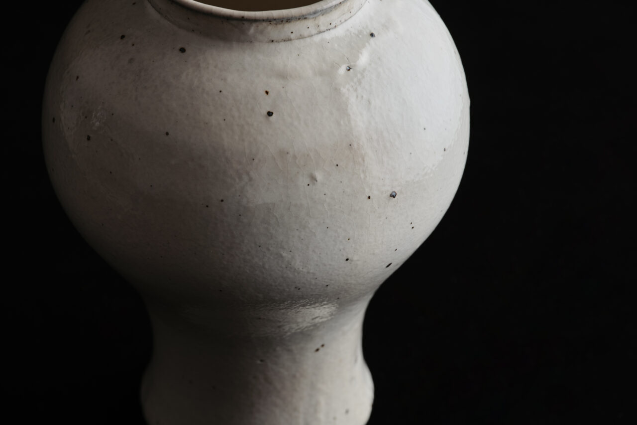 Hideki specializes in gen-yu or black glaze, wherein flecks of gold and silver glint from within deep black, but he also uses a variety of other techniques such as Mishima and Hakeme as his own. This work, fired with a thin layer of glossy devitrified glaze on white slip, has a beautifully fresh and clear white color and seems to be filled with moisture. The shading of the richly applied white slip, the black iron powder that appears in places, and the delicate kan-nyu or crackles that cover the surface are just a few of the many highlights of this work.