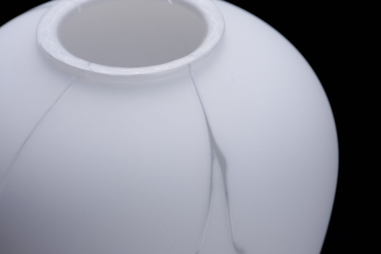 The “Kokusho Zuikan Vase” was crafted by manually carving patterns into white glass layered over transparent glass, after which another layer of transparent glass was wrapped around it using the blown glass technique. Finally, the white areas are sandblasted, creating a refined appearance where light seems to leak through the lines of transparent glass.
