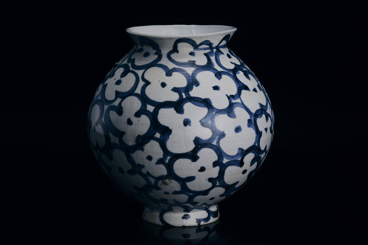 The form of this work was inspired by the “moon jars” of the Joseon dynasty in Korea, porcelain vessels named for their resemblance to the full moon. While evoking the nostalgia of an antique, the surface of this piece is adorned with delicate sometuke indigo floral patterns, giving it a gentle, contemporary charm. On the front, the motifs appear bold and clear, while the back features overlapping patterns, creating soft nijimi blurs and variation that generate a refined visual rhythm. By slowly tracing the interplay of white and varying shades of indigo with your eyes, you can discover multiple expressions within a single jar. It is a piece that offers a poetic sense of space.