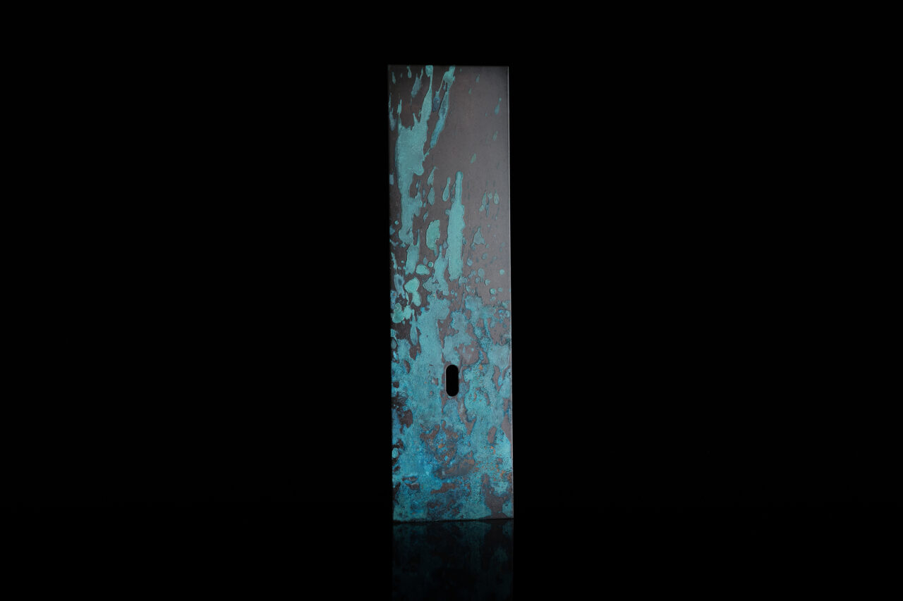 This wall-mounted vase made of copper plate, which looks like an abstract painting drawn with powerful brush strokes, was colored by Takaoka craftsmen using their unique metal coloring technique. The blue-green pattern that gushes out like spray from crashing waves is a distinctive feature of this work, and no two pieces have the same pattern. It is a piece with a variety of charms that will never grow old, and can be enjoyed in a different way by with the addition of flowers.