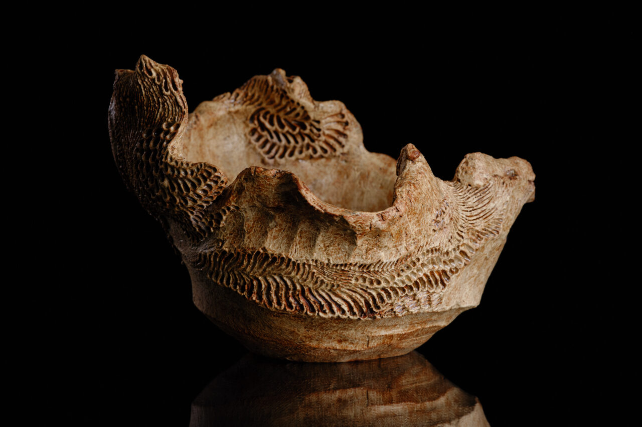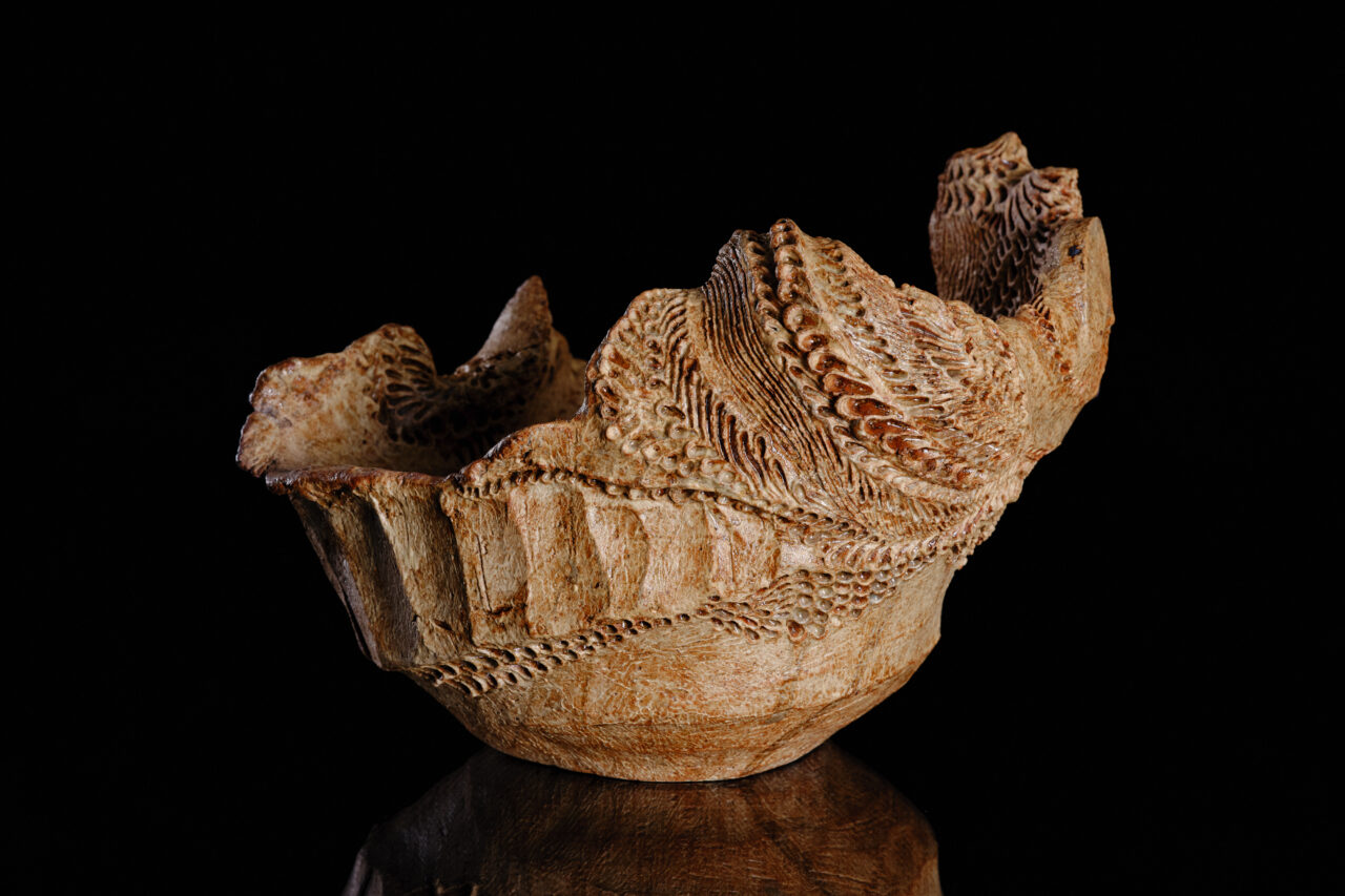 The “Ryumon Bowl,” (literally, “grain pattern ware”), hand-formed and individually engraved with patterns before firing, exhibit an organic form akin to shells weathered over time. The engraved patterns resemble both plant leaves and bird feathers, while the tactile sensation of the clay’s rough texture adds to their allure. This pieces evoke a sense of something grand and transcendent, such as the interplay of time and space or the connection between earth and life.