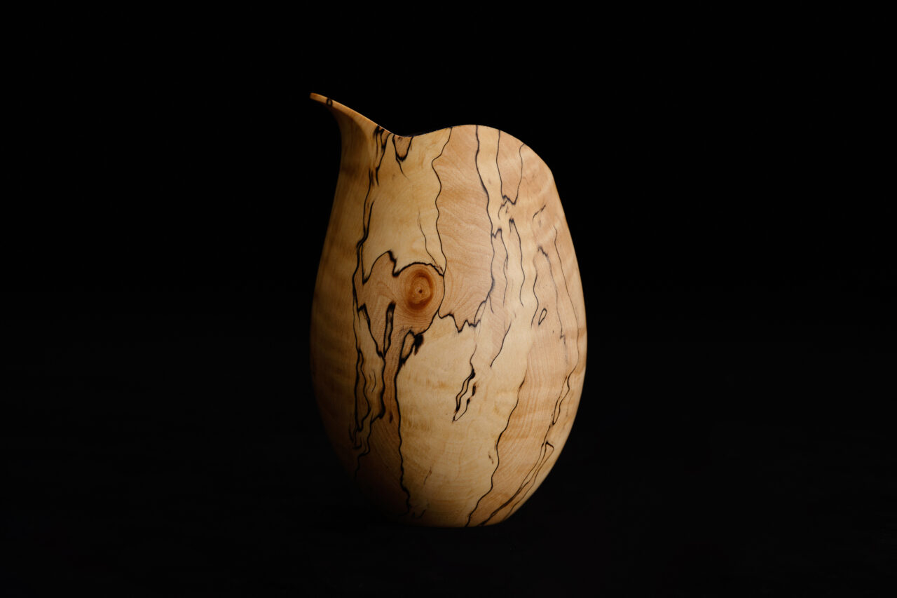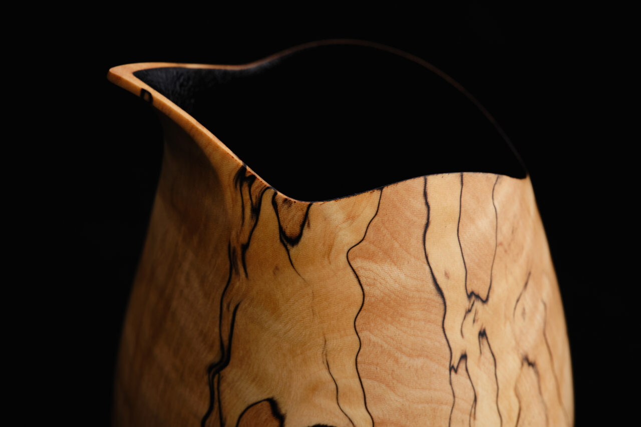 This work, Shimadori or “Striped Bird,” was created using a piece of horse chestnut with a pattern of black streaks caused by the growth of bacteria. This kind of wood is called “spalted” and is usually discarded, but Eiko found a beauty in the naturally occurring patterns and brought out the best of this Japanese horse chestnut’s individuality. Her work, born from her flexible approach, gives viewers a fresh impression and makes them aware of the unique beauty of the material. The dignified shape is also somehow lovely, and unconsciously makes you want to caress it.