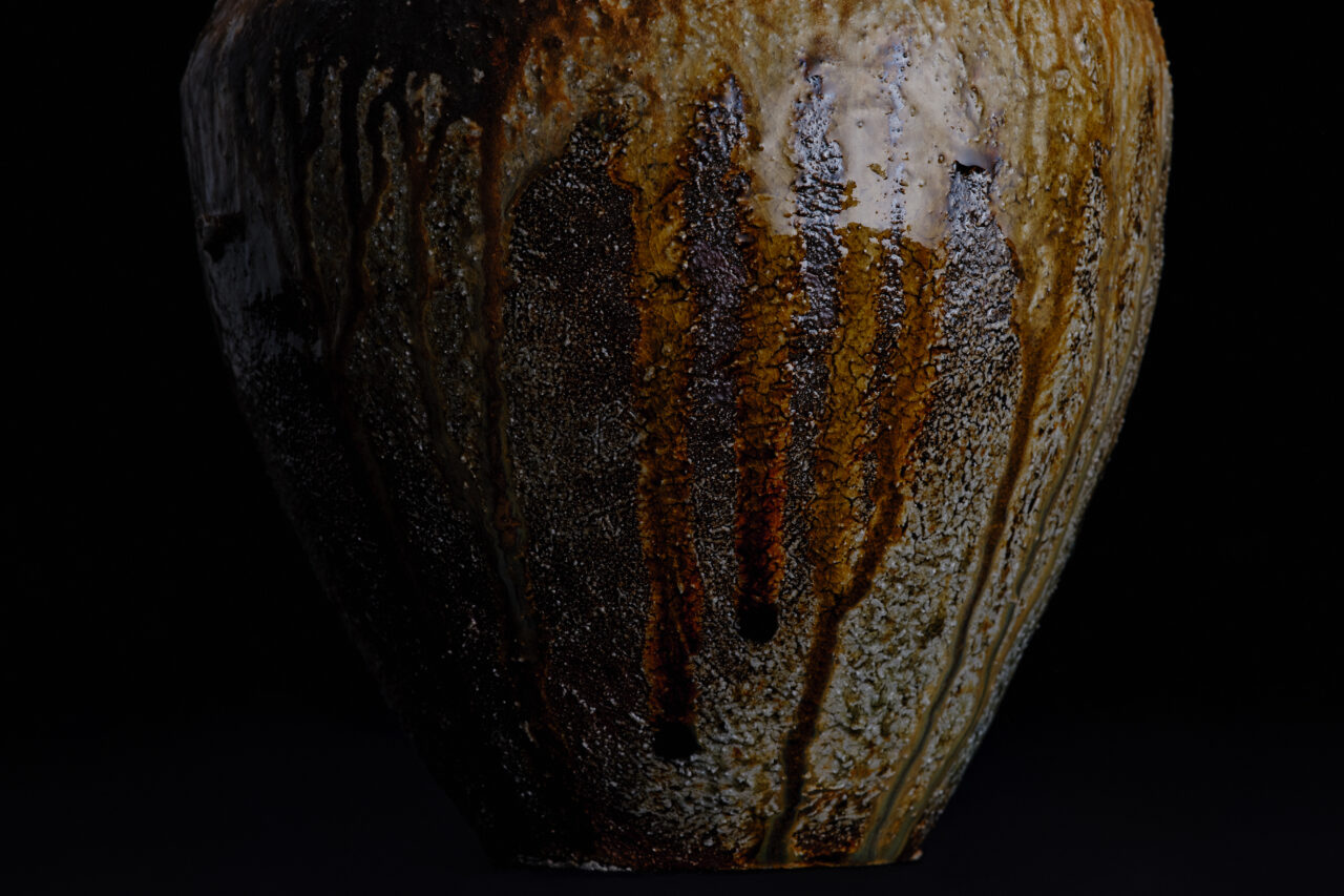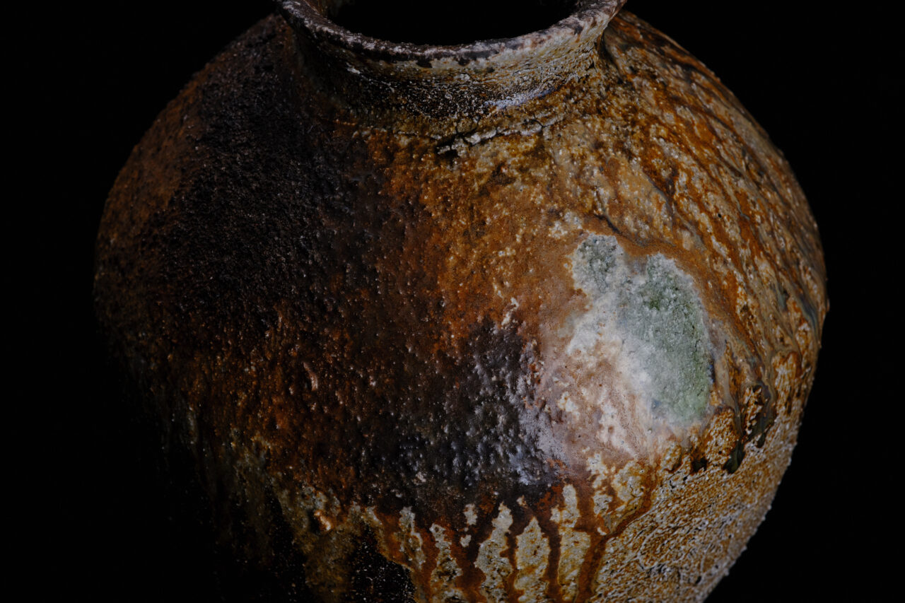 Titled Tanba Jar, this work by Masahiko Imanishi was created using clay from the mountains of Tanba and fired in a ja-gama (literally, “snake kiln”), a traditional long and narrow kiln unique to that region. Masahiko is a ceramic artist with a profound passion for medieval Ko-Tanba ware, especially jars. Reflecting on the materials, wood-fired kilns, and potters of Tachikui who shaped Ko-Tanba ware, he constantly questions the significance of ceramics created in this region by a contemporary artist like himself, while continuing to pursue its beauty. As he says, “The charm lies in the variety of expressions you can see in a single jar.” Indeed, the body of the Tanba Jar showcases diverse colors and textures created by the hai-kaburi process, in which the ashes of the wood transform into a natural glaze, creating a surprisingly different impression depending on the angle from which one views it. The ja-gama, unlike a regular climbing kiln, is lower in height and narrower. The gentle slope of Masahiko’s kiln in particular allows the flames to dance around the pieces, firing them and the earth together, resulting in even more intricate expressions.