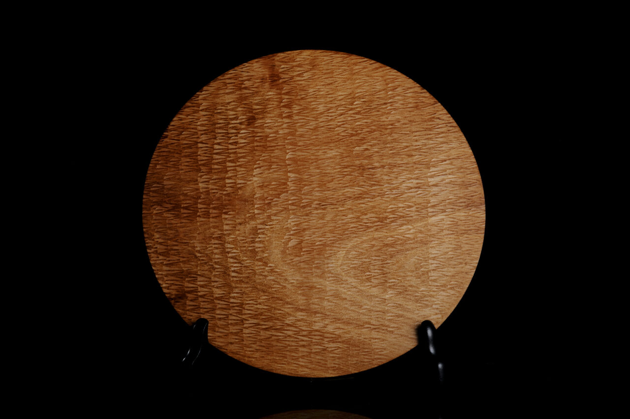 This wooden plate, named “Tanmoku-zara,” was inspired by one of the traditional techniques of Takaoka lacquerware, in which pieces are engraved and lacquered. A metal craftsman engraves delicate hammered patterns with exquisite care on a 100-year-old horse chestnut tree shaped by a woodturning craftsman with a plane and a rokuro, or spinning lathe. When raw lacquer is applied over the wood, shadows appear like traces of rain on the grain of the wood. This beautiful piece, made through the skillful collaboration of artisans in Takaoka, a town known for its lacquer and metal crafts, has the warmth of handiwork in their elegant appearance.
