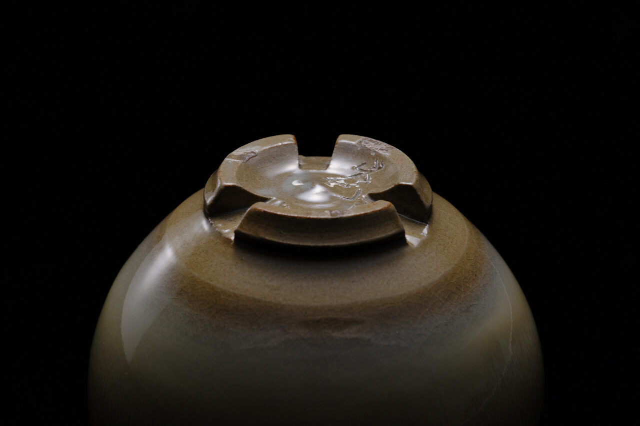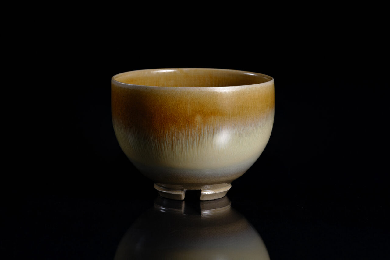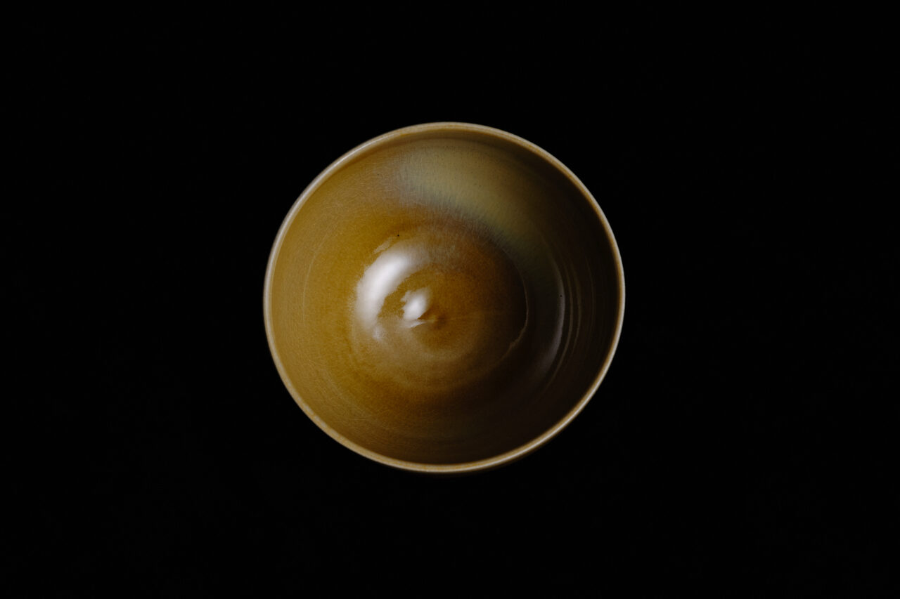 Takao’s current focus, Ryuhaku glaze, is a unique creation inspired by ancient ceramic fragments found at the historic Sonose kiln site, born from his experimentation with different glaze formulations. He layers glazes made with straw ash and pine ash over the Daido-tsuchi clay of Hagi, creating a natural yet bold shift in color from brown to pale green. The elegant shape, which beautifully showcases the fine vertical streaks of the flowing glaze, is solidly supported by the kiri-kodai or “cut foot” of the bowl, one of the characteristic features of Hagi ware.