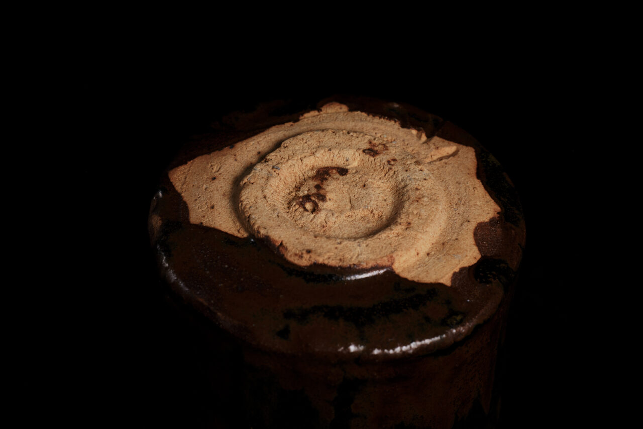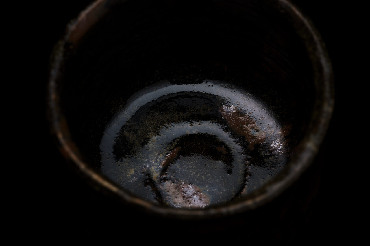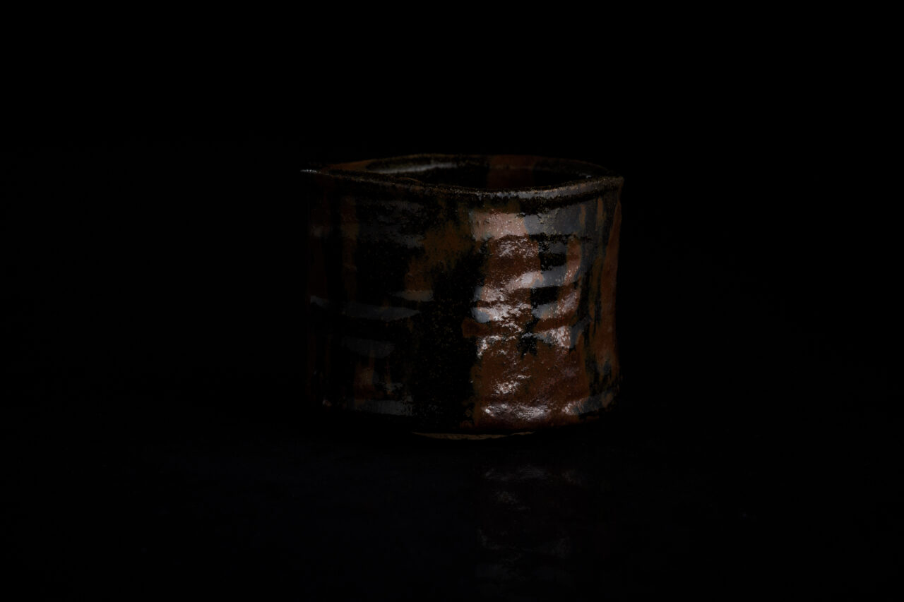 One particular style of Mino ware, called Tsubaki-de from the Japanese words “tsubaki” (camellia), and “de” (hand), features a variety of colors ranging from yellows, browns, and blacks to occasionally even a reddish hue like a camellia flower depending on the amount of iron in the glaze. This Tsubaki-de Tea Bowl, created by Ryotaro Kato over several days of continuous firing in the ana-gama “cave kiln,” exhibits a complex color of reddish-brown mixed with black, creating a deep and intricate color impression. The contrast between the unassuming earthy texture of the soil visible on the kodai or foot of the bowl and the glossy glaze that extends to the edge of the kodai also exudes a sophisticated character. The pleasant feel of the bowl, snuggling perfectly into one’s hand, is a feature of its solid semi-cylindrical shape, and a result of the artist’s familiarity with the tea ceremony. The work exudes an unwavering dignity, while also brimming over with the energy and passion of an artist enthusiastically engaged in the creative process.