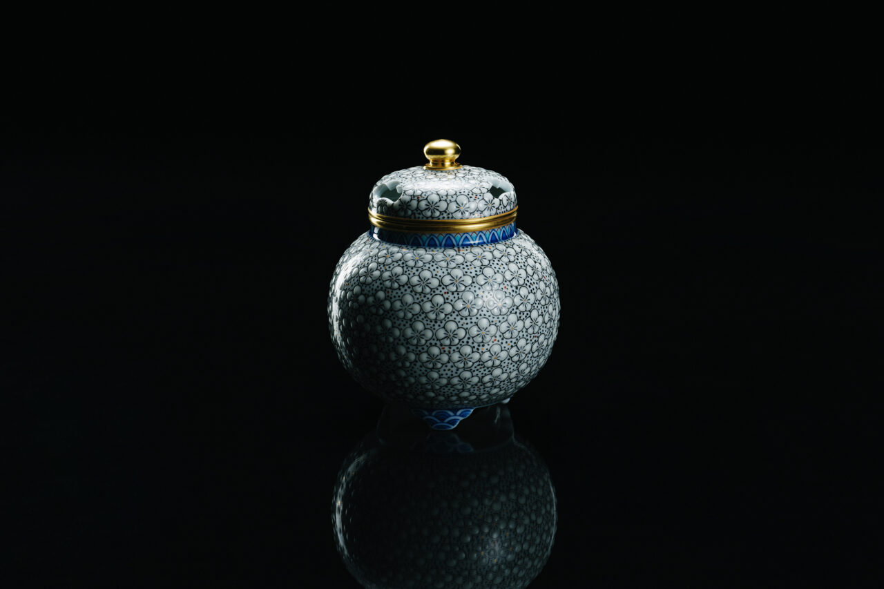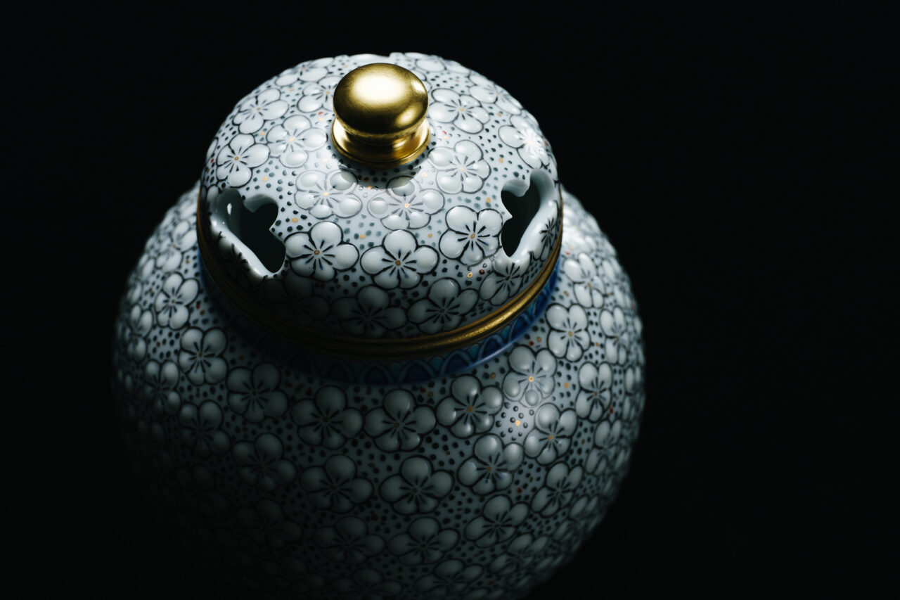 An incense burner filled with a three dimensional pattern of white plum blossoms. The plum blossom petals spreading all over the surface are softly elegant and evoke the exuberance of the coming of spring. The knobs and legs are decorated with gold and sometsuke, a blue and white painting under transparent glaze, giving the piece a noble impression. The ume-zume (literally, “packed with plum blossoms”) pattern, which is carefully hand-painted by a painter specializing in porcelain, has been passed down from generation to generation as a unique design of Hataman Touen, a kiln in Imari Nabeshima, Saga Prefecture. With its high level of painting technique, this piece is a gem with outstanding appeal and a unique expression of auspicious motifs beloved by the Japanese people.