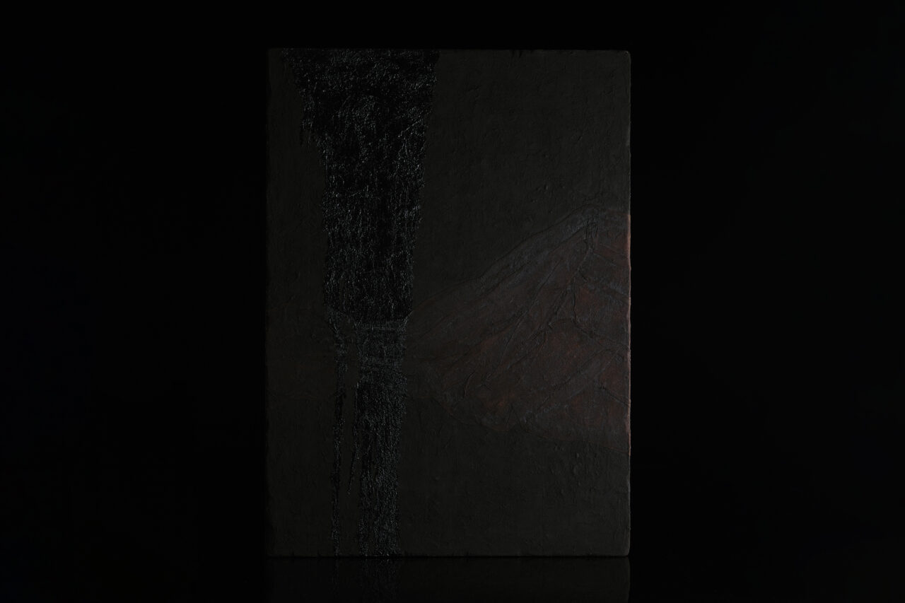 “Untitled” by Akihiko Sugita was created by covering the base wood with linen and then applying black lacquer overtop it. The linen is used in a traditional lacquer art technique called “kanshitsu”, (literally, “dry lacquer”). The wrinkles and patterns of the linen cloth give the piece its unique texture as mentioned above. Based on the assured techniques nourished by tradition, this work boasts a high degree of artistry and sophistication in a single work.