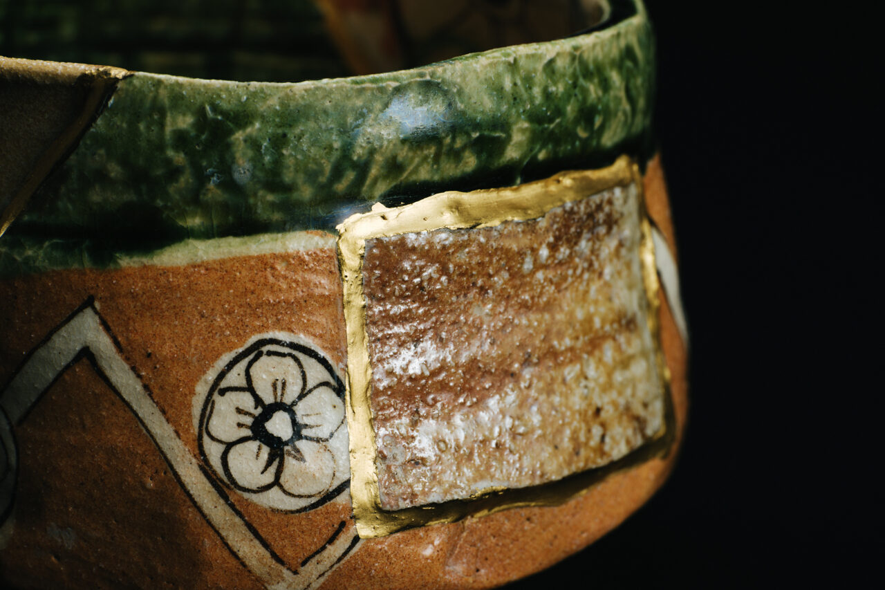 Shigaraki, Oribe, Shino, and Ki-Seto. In “Yobitsugi Tea Bowl,” a piece hand-crafted by ceramic artist Katsunori Sawa, one can savor the captivating landscapes of all four types of ceramics in a single tea bowl. The richness of Shigaraki, fired in a wood kiln, and the semi-transparency of Ki-Seto blend harmoniously with the light brushwork of Oribe and Shino, while the gold seams act as accents, eliciting admiration from connoisseurs.