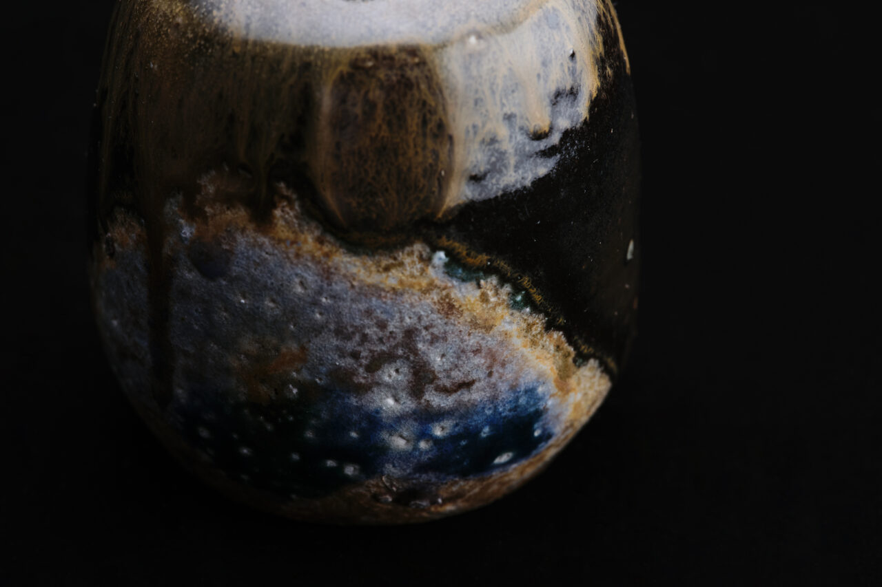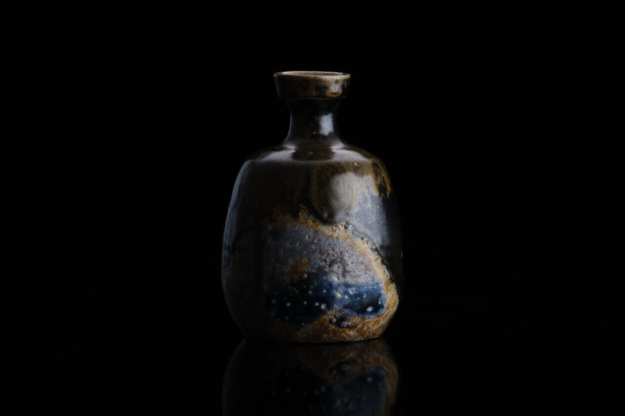 This work, “Yohen Blue Tokkuri Sake Flask,” is part of his “Yohen Blue” series, his signature work. The glossy black of the iron-rich clay ties the entire piece together, while his uniquely blended clay mixes with the flame to create a vivid blue color. This artistry added to the everyday character of a tokkuri sake flask seems to bring a special comfort every time it is used. Takashi’s works are suffused with hints of the new potential of Bizen ware.