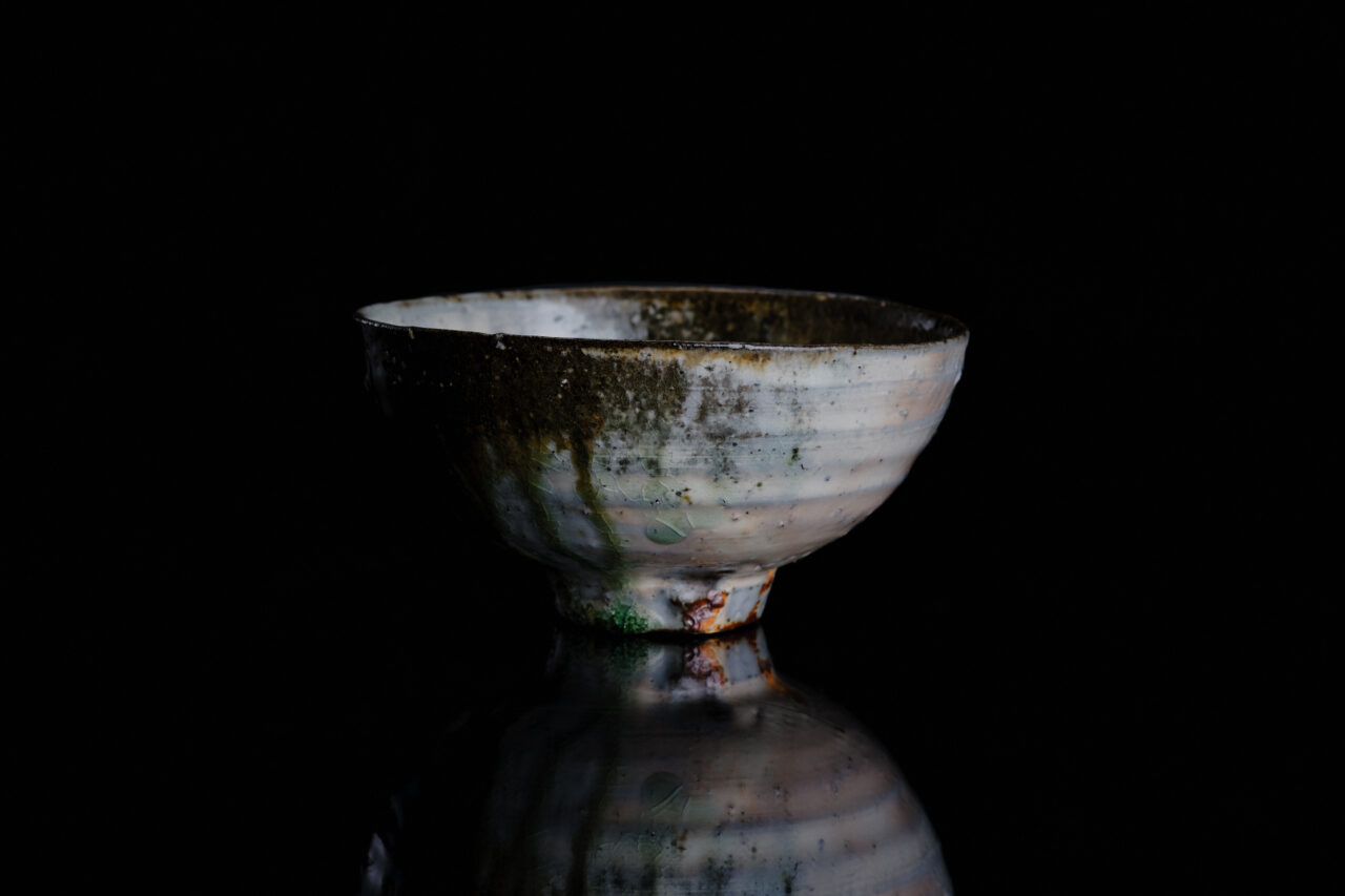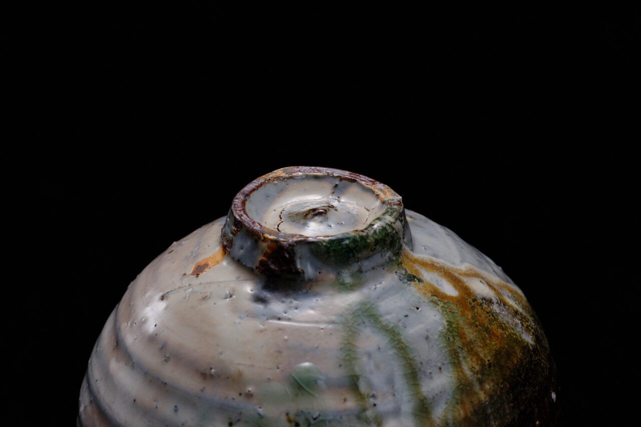 There may be no other work that more fittingly expresses “nature” than this work. The Yohen Kohiki Tea Bowl features soft, cloudy kohiki white, accented with shades of red, deep brown hues that blend with the scorched marks like moss-covered rocks, and vibrant green streaks of glass, all harmonizing within the bowl as they shift from the interior to the rim, body, and foot. The varying expressions create a sense of balance, evoking the feeling of standing in the mountains and gazing upon the natural landscape.