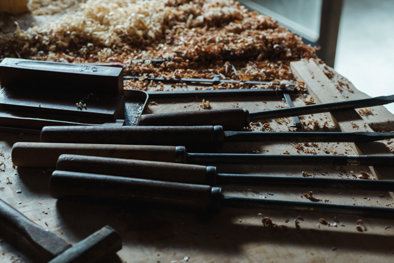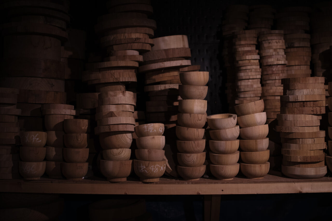 This environment blessed with nature has nurtured delicate handicraft techniques. Ishikawa Prefecture, where Yamanaka is located, is famous for its wide variety of crafts, as reflected in sayings such as “Wajima of lacquering,” “Yamanaka of woodworking,” and “Kanazawa of maki-e (lacquer decoration)”, referring to distinctive techniques which have been handed down from generation to generation in each region. Yamanaka is currently the largest producer of hikimono-kiji (wooden bases for lacquerware) in Japan.