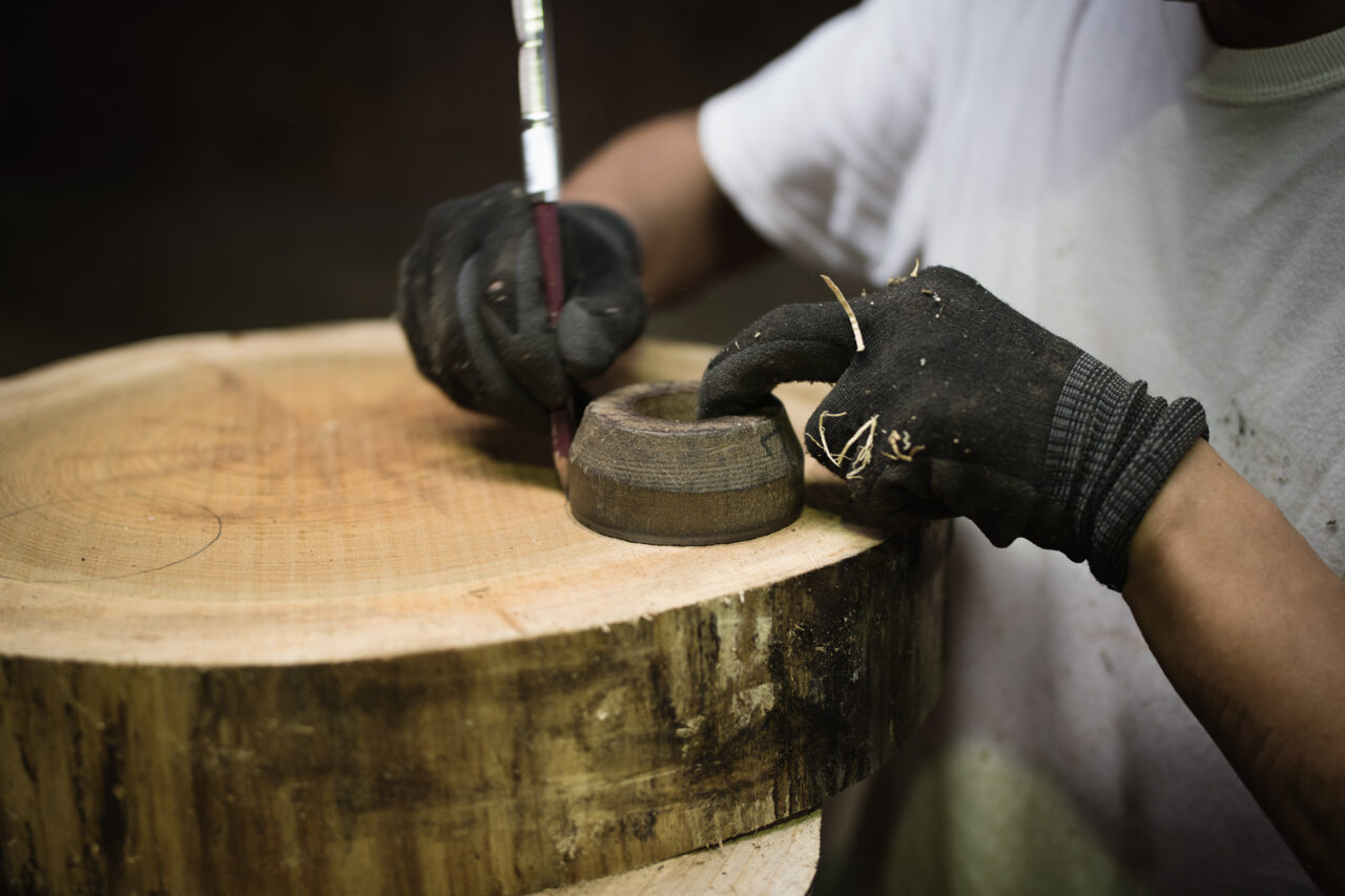 The woods used in Yamanaka are mainly zelkova, Japanese cherry birch, and Japanese horse chestnut. The “fuki-urushi” finish, in which lacquer is applied and wiped off repeatedly to highlight the beauty of the grain of the wood, is also an essential technique for Yamanaka lacquerware. It is no exaggeration to say that kijibiki, and fuki-urushi are the core elements of Yamanaka lacquerware, enhancing the beauty of the materials and revealing the essence of its craftsmanship.