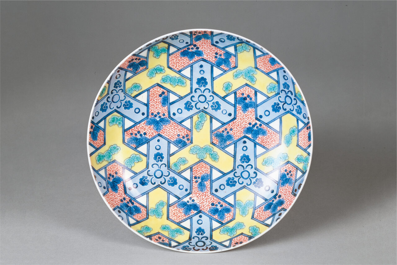 “Dish, decorated with hexagonal pattern design in underglaze blue and overglaze enamels”