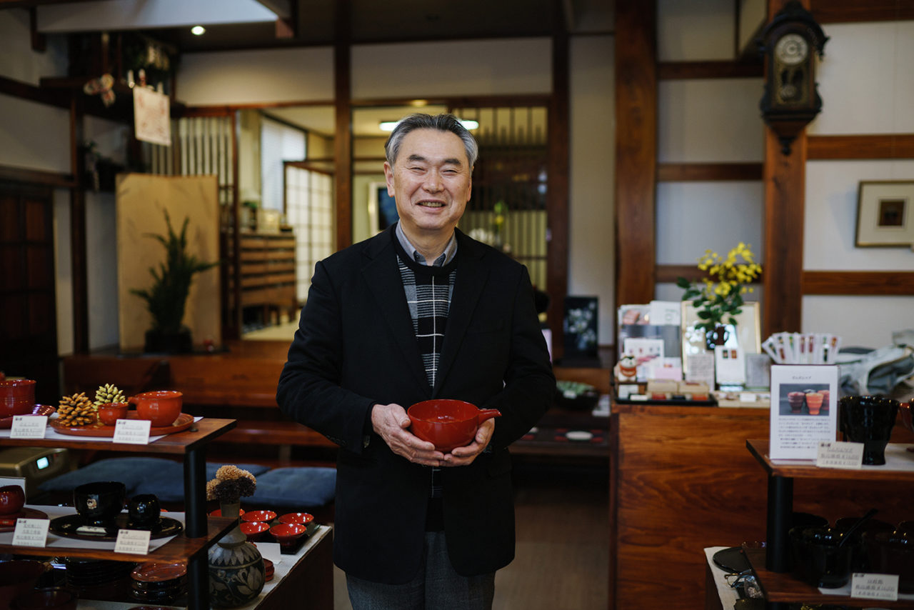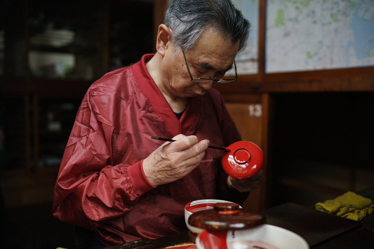 Mr. Masahide Shioji is the third head of the family of “Tohachiya” which is a manufacturer and vendor of Wajima lacquerware, called “Nushiya” in the region. After graduating from university, he began his apprenticeship to take over the family business and gradually he became devoted to the works of artisans. However, his father told him to do works related to being a merchant, not an artisan as he was concerned because the customary role of the head of “Nushiya” in Wajima was in sales and product planning of lacquerware, and actual process of manufacturing should be entrusted to the artisans. Nevertheless, contrary to his father’s intention, Mr. Shioji continued to practice his craft while staying in Tokyo for half of the month to engage in sales tasks. Till today he still visits his customers such as Japanese style fine restaurants to take orders of lacquerware for professional-use and for every order, he takes care of the finishing process of painting called “Uwa-nuri” (top coating) with his own hands. The most important thing in his work is to listen to the voice of people who use the actual products on site. With that belief, Mr. Shioji has been working for many years to make the strongest lacquerware in Japan. “Through my work I think about my customers and with that I get a sense of fulfillment every day. I would be grateful if the sturdiness of our products is recognized as a Tohachiya brand, beyond the general evaluation as a Wajima-nuri.” says Mr. Shioji. The uncompromising quality of his products provide a beautiful background which flatters food.
