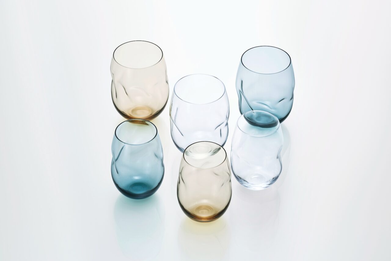 The exquisitely swaying shape of “Kagiroi” encapsulates the fleeting expression of the glass crumpling slightly as it is heated in the center, preserving the momentary transformation within its form. The shadows cast by the curves appear like a heat haze, while the recessed parts fit comfortably in hand.