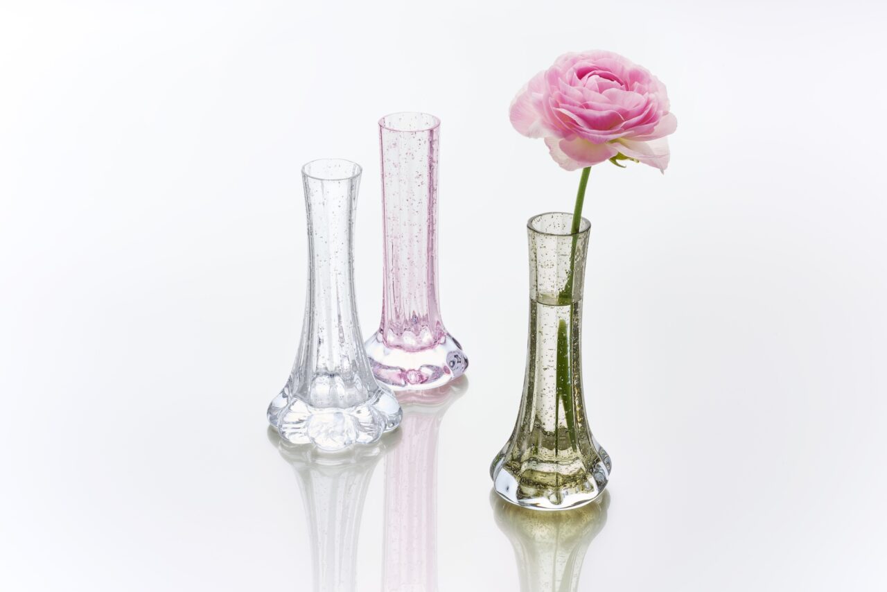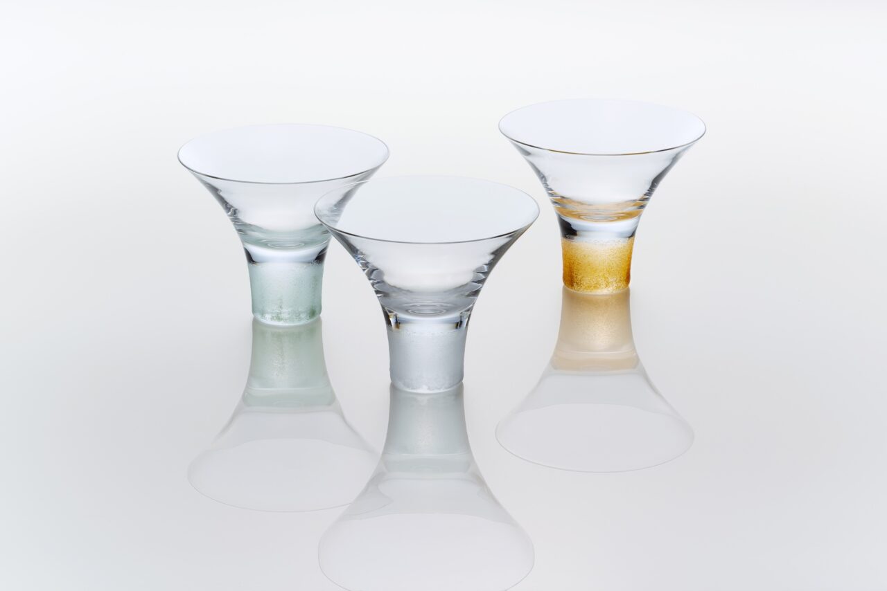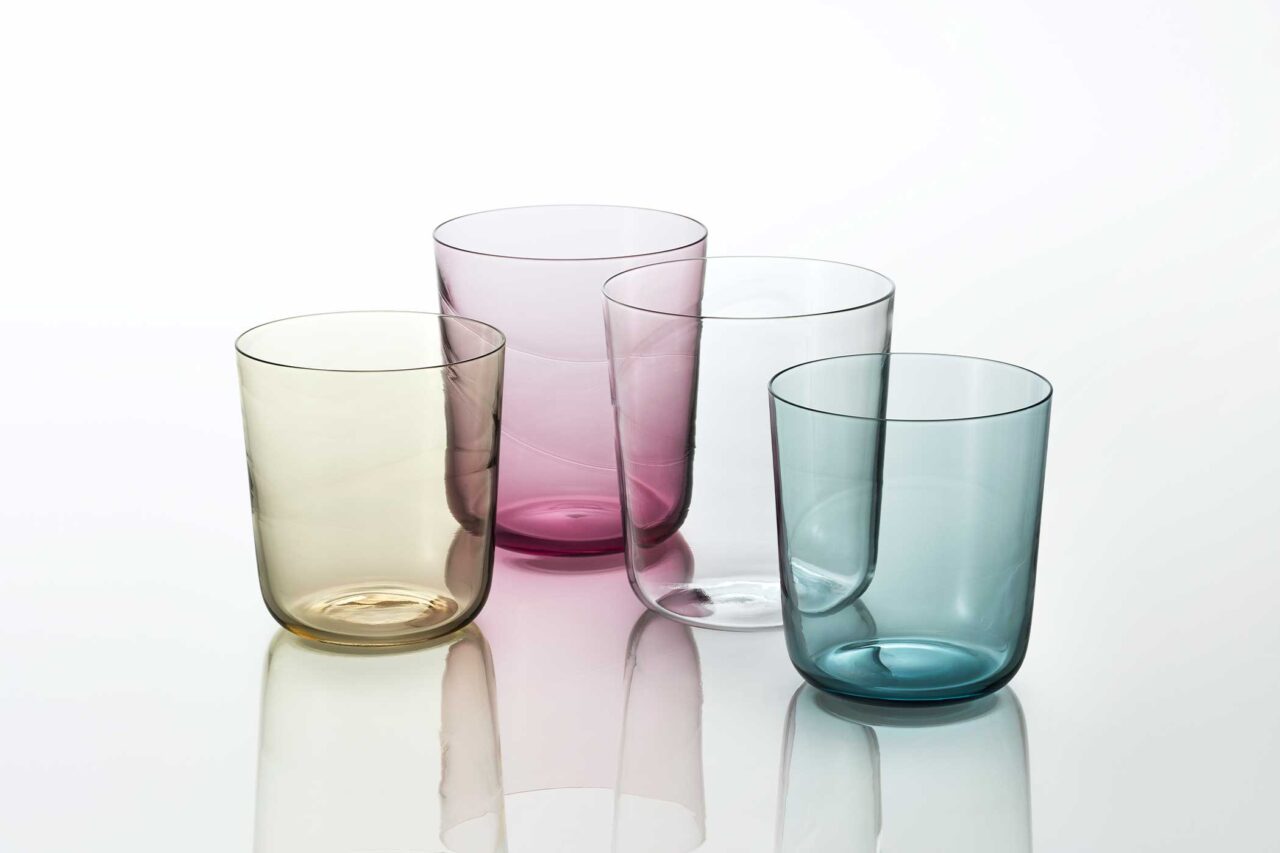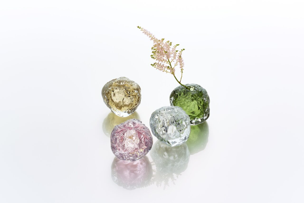 “Lucis” showcases a shimmering texture by incorporating mica into glass. Each piece is shaped without a mold, requiring the artisan to carefully gauge the material’s hardness throughout the process. The result is a gracefully fluid design unique to the free-blowing technique.
