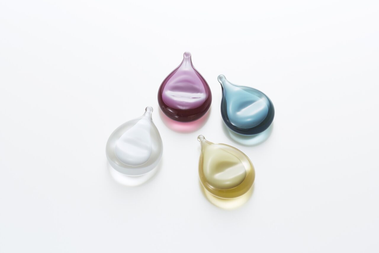 “Shizuku no hashioki” is a chopstick rest made from a fusion of opaque white and transparent colored glass. Achieving uniformity in such small pieces is a delicate process, requiring precise control of both the amount of glass and its softness to form the signature teardrop shape.