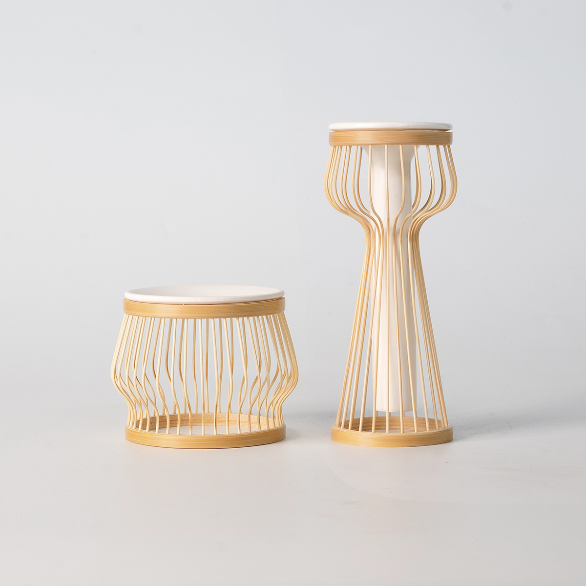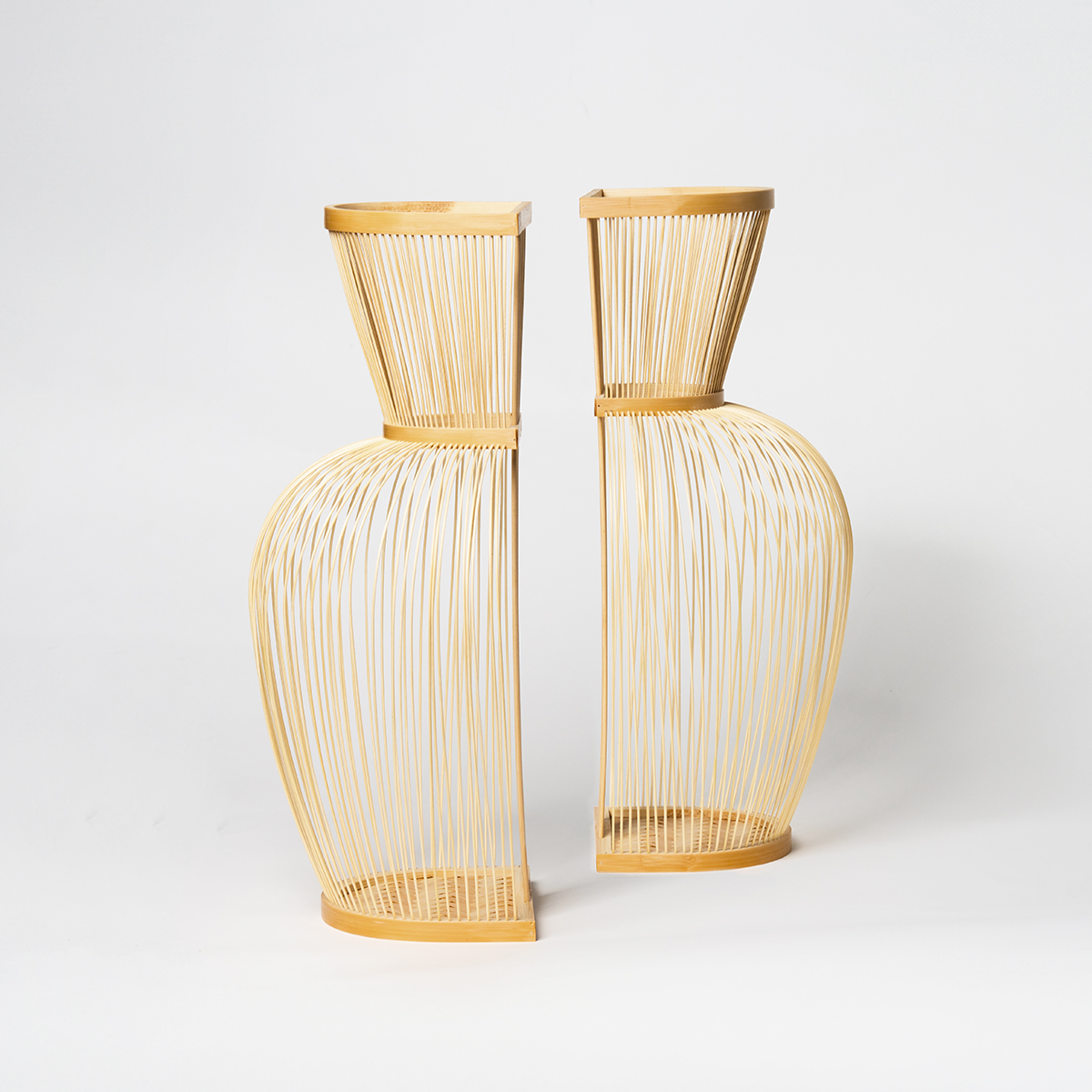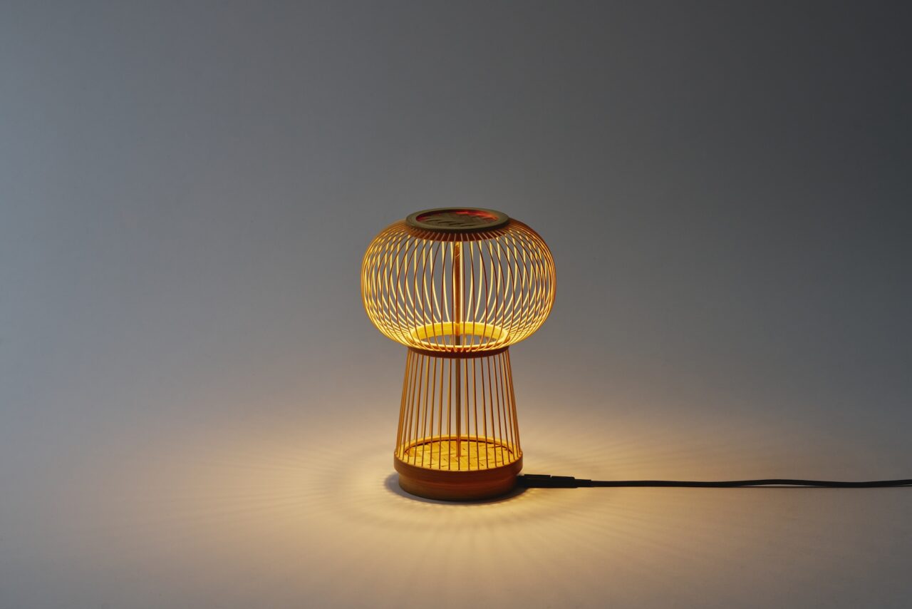 The portable table lamp “sen-kuu” won the Good Design Award 2025. Its sophisticated details that harmonize with modern lifestyle, utilizing the LED lighting technology to beautifully showcase the shadows of Suruga bamboo basketry while making the light source discreet, were highly praised. The light emitted through the elegant form of interconnected bamboo strips creates a sense of tranquil warmth. The “Linea,” a flower vase and aroma diffuser decorate the space with high-skilled techniques that involve a bamboo inward which enhance the beauty of curving line of bamboo. The “Irregular” flower vase, designed like a vertically sliced ring of bamboo casts a beautiful shadow on the wall when placed nearby. The “SEN to EN” is an object that highlight the beauty of the connected bamboo lines. It can be opened and closed, allowing user to enjoy the subtle movement of the bamboo forms. The “Kara,” a container with delicate bamboo strips aligned vertically, combined with a glass surface. The glass surface helps maintain a perfect circle shape, while the lid fits smoothly, making the container easy to stack.