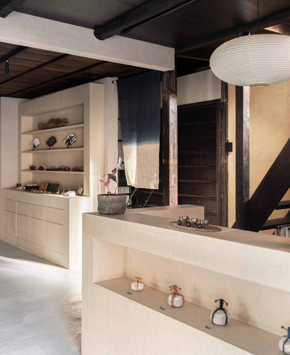The three-story space, renovated from Kyoto’s machiya (traditional townhouse) over 100 years old, is entirely shaped by artisans associated with POJ Studio. It features washi paper furnishings, with interiors by washi artist Wataru Hatano, high-quality tatami mats by tatami craftsman Mitsuru Yokoyama, a custom entrance lantern and noren (fabric divider), and fixtures made from domestically sourced lumber. The store showcases handcrafted items from artisans across Japan, allowing visitors to feel the skill and story behind each piece. The studio also hosts seasonal artisan exhibitions and kintsugi (the art of repairing pottery with lacquer and gold) workshops, as well as offers a repair service for tableware using the kintsugi method.