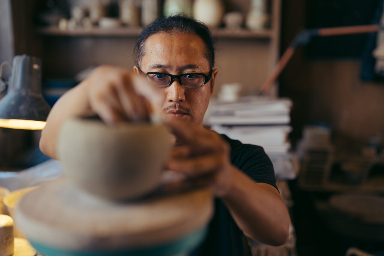 A ceramic artist based in Tajimi, Gifu Prefecture, Ryotaro Kato is the eighth generation of the “Kobeigama” Kiln family. He is deeply passionate about using “ana-gama” (literally, “cave”) kilns and produces mainly Mino tea ceramics in styles such as Shino, Seto-guro and Oribe. He is also well versed in the tea ceremony and calligraphy, and conveys the beauty of Japan’s unique culture through his works. While building on tradition, he continues to actively refine his own sensibilities and take on the challenge of new projects.
