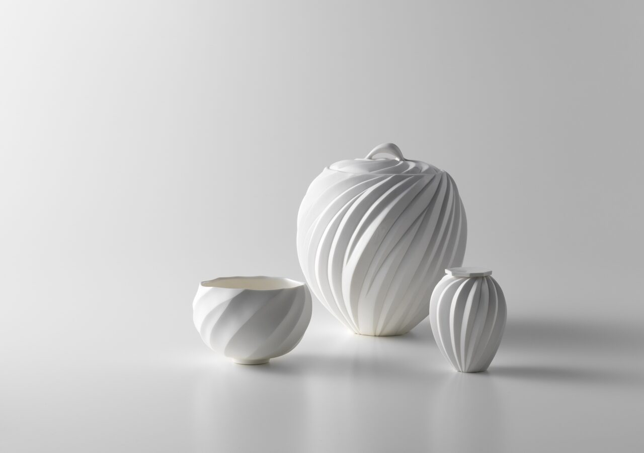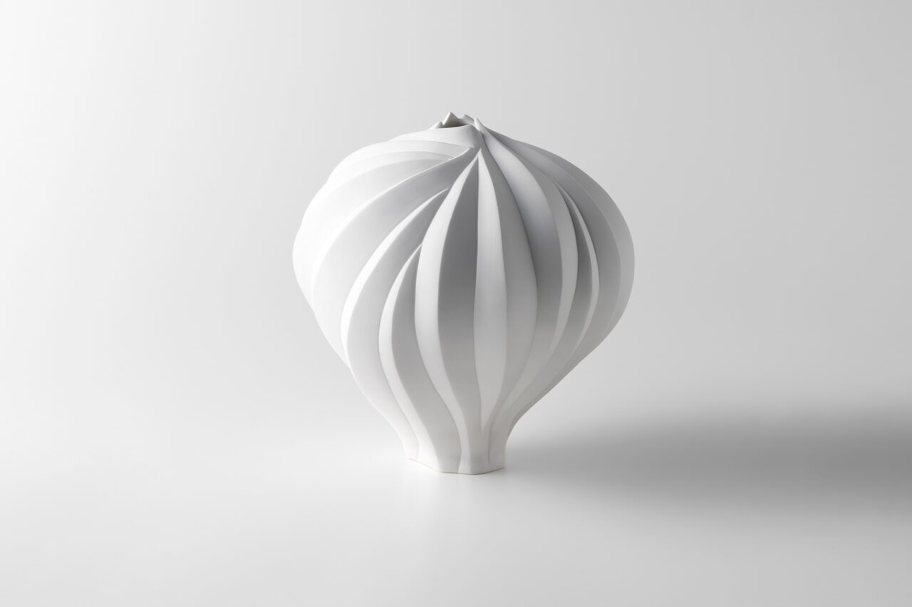 柔らかな曲線が作る凛とした佇まいの中に、一抹の緊張感が漂う。無垢な白に映し出される光の陰影は、時に淡く時に鋭く、移ろう時間の中でゆっくりと流れていく。一つひとつの作品のあらゆる瞬間に、自然の造形美を繊細に感じ取る高橋氏の美意識が宿っているのであろう。