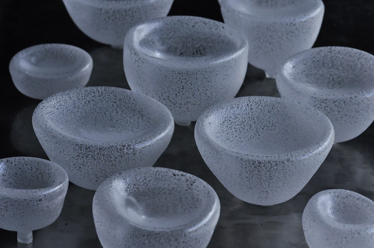 水面を漂う泡沫を映したかのような、美しいガラスの煌めき。形の作為性と泡文様の無作為性が共存する関野ゆうこの作品には、日本人らしいきめ細やかさが随所に見て取れる。そこには、混じりけの無いガラスの美へのアンチテーゼとともに、ガラスが持つ美しさの無限の可能性が秘められている。