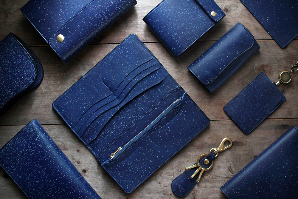 enkuでは、徳島産のすくもで藍を建てて染色し、ブライドルレザーやグラデーション染め、昔ながらの米ぬかともち米糊を使った型染めなど、藍染革を様々な染め方で表現している。素材の違いはもちろんのこと、気温や湿度によっても、染まり方は大きく異なるため、熟練した技と経験が必要になる。こうして染めあがった革は、一点ずつ原田さん自身が製品へと仕上げ、財布やコインケースなどの革小物として世に送り出していく。