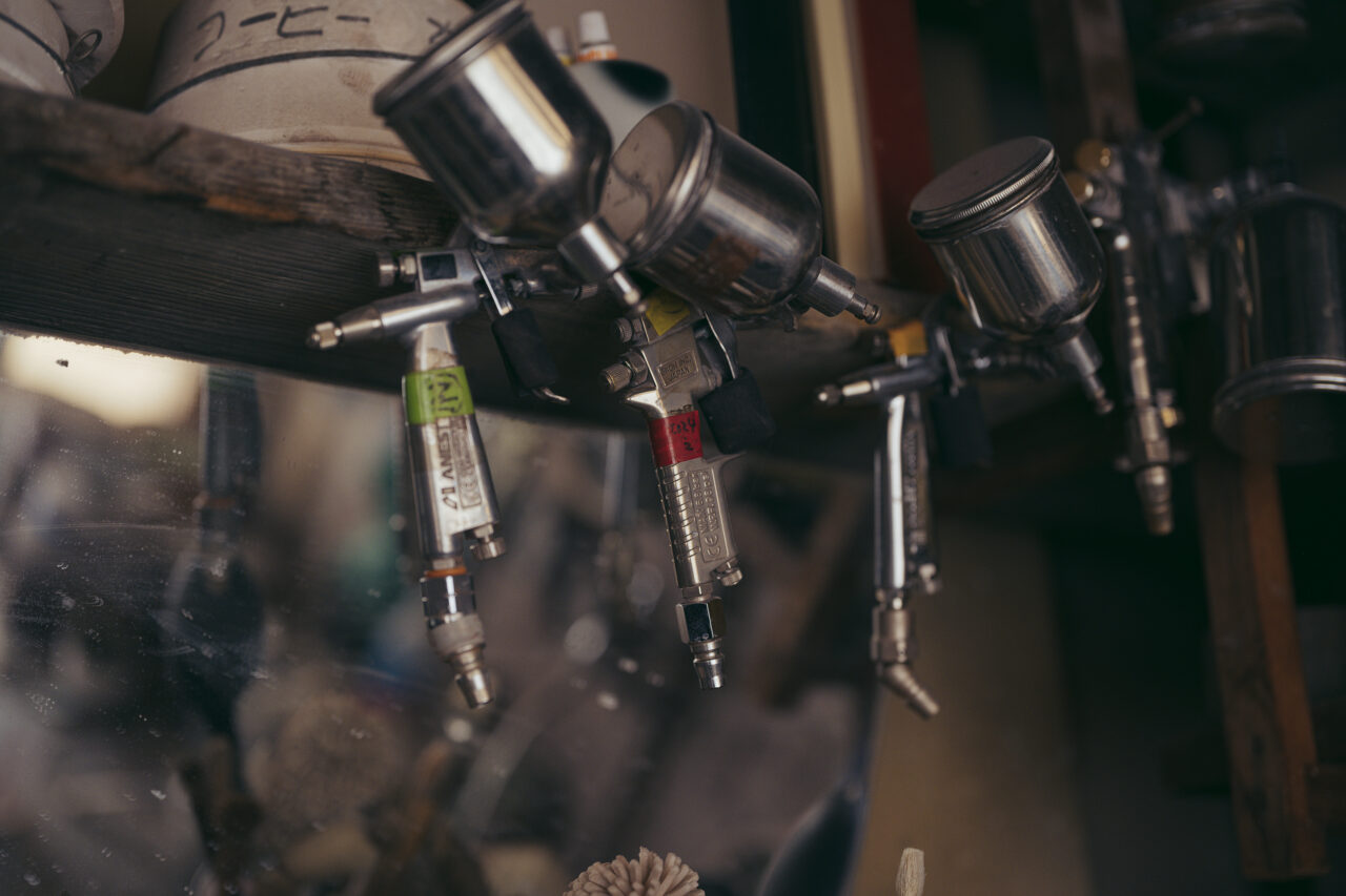 白地に青の涼やかな染付は、砥部焼の代表的な特徴として挙げられることが多い。竹西さん自身も染付の青が好きで、自分なりの青を追求していきたいという思いがあった。そこで、自ら山で採取した10種類以上の石を砕いてコバルトとブレンドし、試行錯誤の結果独自の呉須を開発、他にはない青が生まれた。当初は呉須を刷毛で素地に塗るという方法を採用していたが、個人作家としても活動する竹西さんは、自らの個人作品の制作技法として活用していた「吹付」の技法を呉須に応用し、繊細で滑らかな青のグラデーション表現が実現した。これが《ヨシュアブルー》シリーズ誕生の経緯である。青の探求の始まりから、実に10年の歳月が経った頃のことだ。これが道後温泉の旅館で人気となり、次第に《ヨシュアブルー》の需要は高まっていった。現在では砥部の他窯元とのコラボレーション商品の開発など、さらなる商品展開に力を注いでいる。