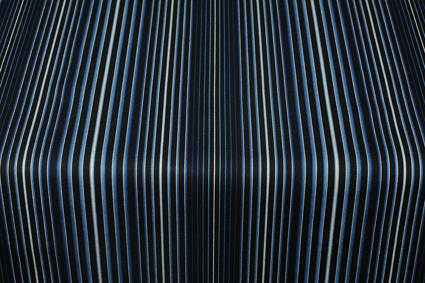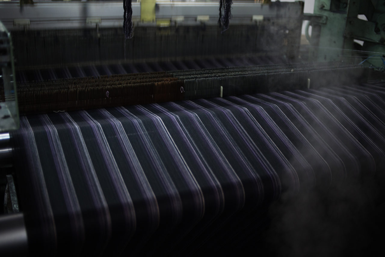 小倉織は、良質の木綿の糸を使用した先染めの平織り物。細い糸を高密度で織ることから、かつては「槍をも通さぬ」と言われたほど丈夫であり、しなやかさと滑らかさも兼ね備えている。美しいたて縞の奏でるリズムが心地よいこの織物は、その製造方法も特徴的だ。まず特筆すべきは、経糸の数である。小倉織は、緯糸1本に対して経糸3本が使用されている。一般的な生地と比べて密度の高い経糸が緯糸に重なり、色の濃淡が緩やかなグラデーションとなって、たて縞の表情が浮かび上がる。また、使用される糸は60双(ろくまるそう)という細めの糸で、この糸の細さと経糸の密度が、小倉織の滑らかな質感を演出。使い込むごとに光沢が増し、なめし革のような独特の質感へと変化する。この経年変化も、小倉織の魅力の一つである。だが、細い糸を使用した高密度な織り方は、経糸が切れるトラブルが起こりやすいため、熟練の職人技が欠かせない。機械織りにおいても同様で、職人らが常に細心の注意を払って製造している。