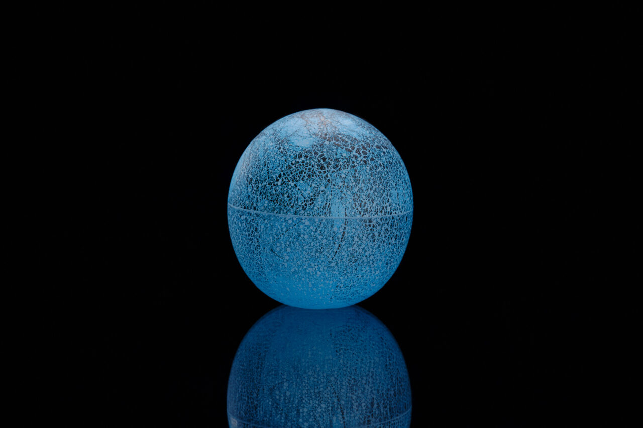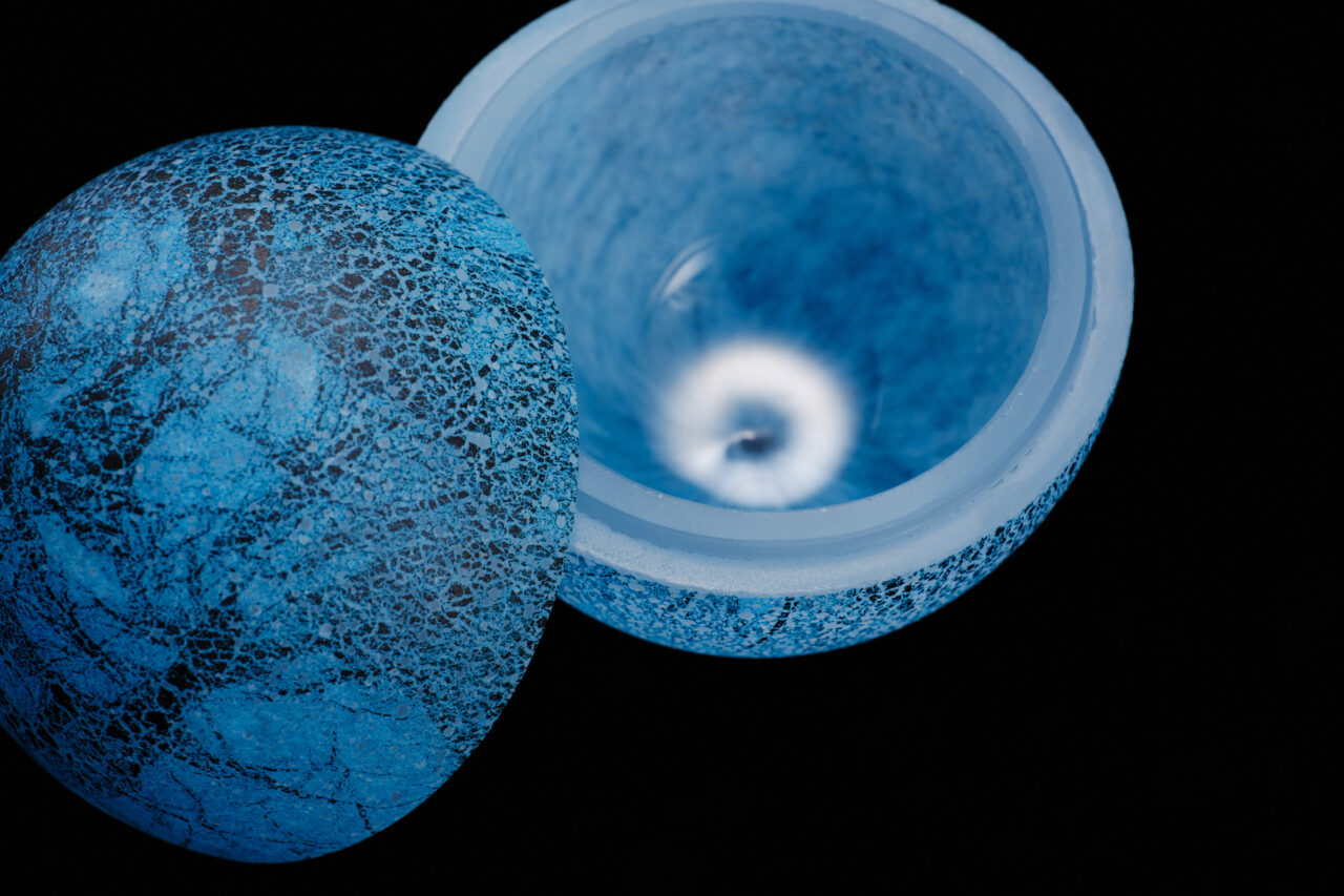 青く輝く球形の蓋物は、まるで空から眺める地球を写したかのようだ。作為が及ばないガラスの変化を巧みな技術によって研ぎ澄まされた形に留めた作品は、その名の通り、儚く美しい魅力を湛えている。
