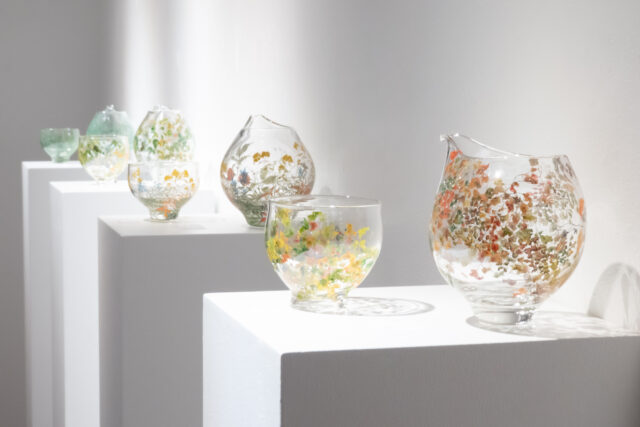 透明なガラスに夏の景色を情感豊かに切り取った本作《青の瞬》は、西山氏の真骨頂である「吹きガラス」と「絵付け」の技術を駆使し、融合させて作られたもの。奥行きを出したい箇所にはあらかじめサンドブラストを施すという細やかな手技も生きている。真夏の北海道で作家の目に鮮烈に焼き付いた青のコントラストは、本作を介して、観る者にその色、輝き、音、温度までをも伝えてくるようだ。身近な自然を慈しむ西山氏らしさがよく表れた作品である。