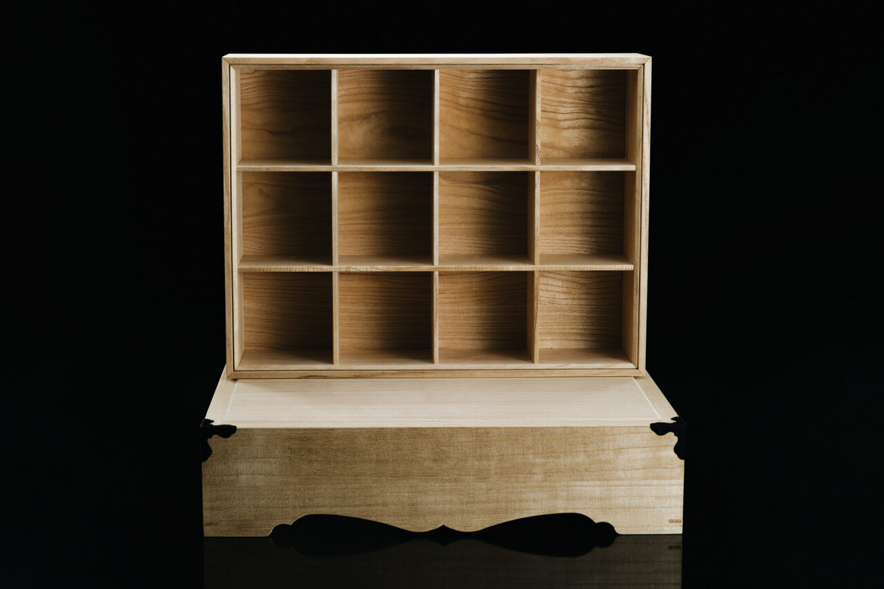越前箪笥「桐Cabinet」 木竹工 工芸作家 小柳 範和(小柳箪笥) 産地 福井県・越前市 サイズ W435 × H106 × D335mm 素材 桐 職人技の結晶 多くの伝統工芸が息づく地、福井県越前で1907年に指物屋として創業した小柳箪笥。4代目となる小柳範和氏は、長い歴史を持つ越前箪笥を現在も製作する数少ない職人の一人だ。指物の技術で組まれ、漆塗りと鉄金具の装飾が特徴の越前箪笥のほか、現代的な作風にも積極的に挑戦している。ぐい呑のために作られた本作は、新潟県産の上質な桐を使用。鉋で仕上げられた美しい木目が清々しく、上蓋の縁の形状や角を保護する金具には伝統的な意匠が採用されている。大切な作品の収蔵にふさわしい、風格ある存在だ。 SHARE WITH