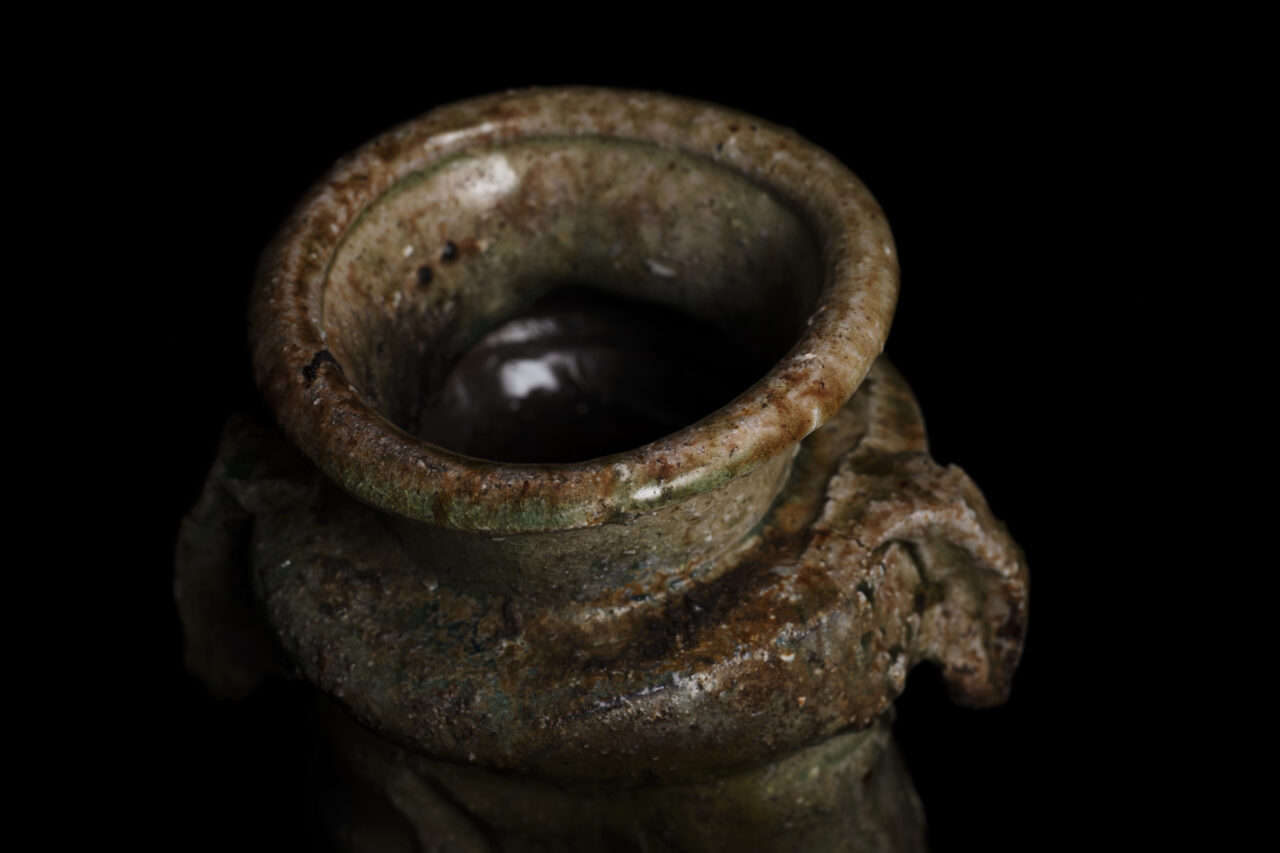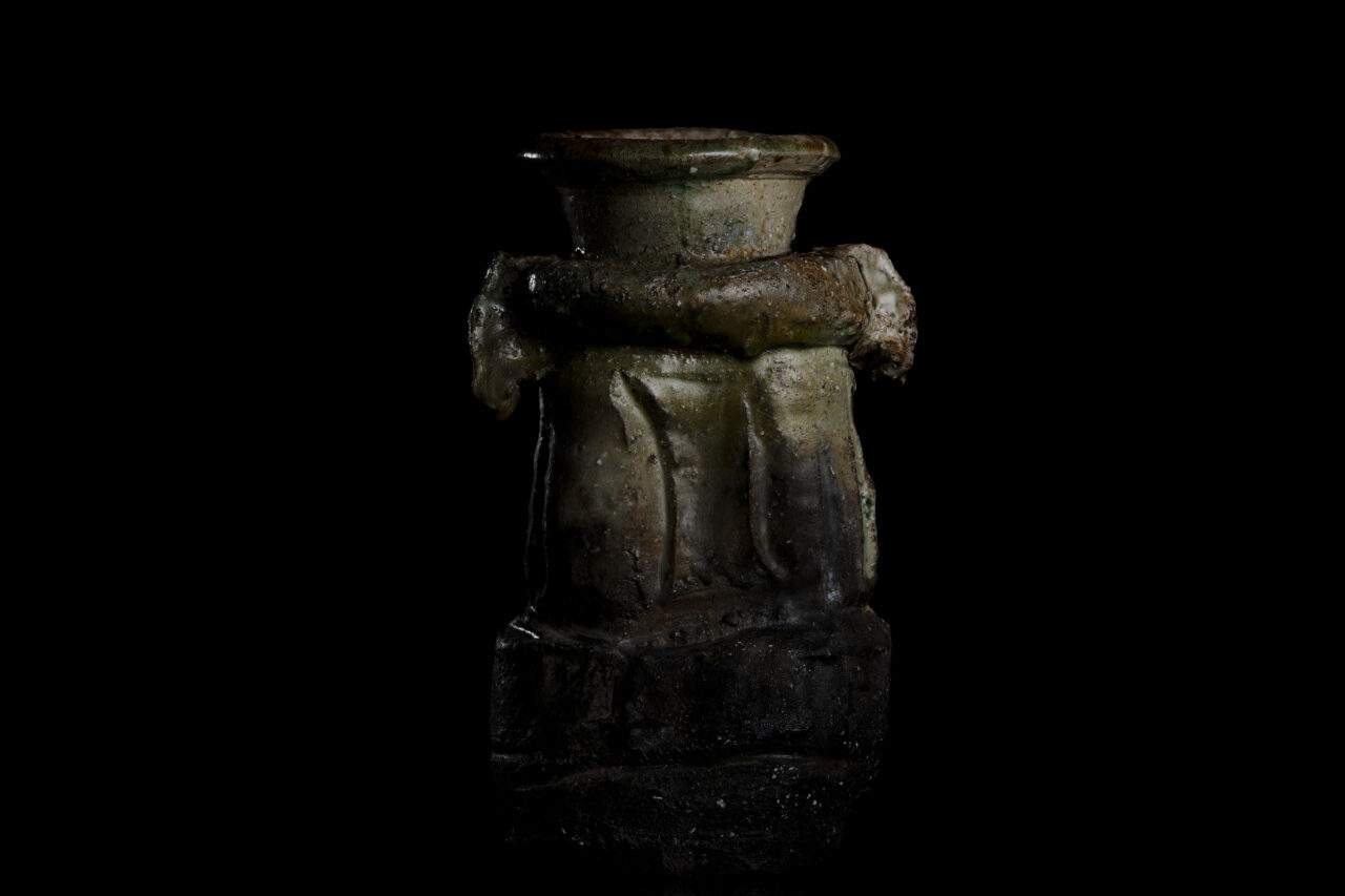 この地で陶芸一家に生まれ育った谷本貴は、古伊賀の持つ破調の美を自身の感性で表現する、この先の伊賀焼を率いる存在だ。独創的な造形を得意とする作家が現代に表す耳付花入は、どこか愛嬌を感じる形姿が新鮮でありながら、古伊賀の伝統を踏襲している。石の粒が見え隠れする土肌は、控えめに緑色を呈する釉で覆われ、裾に広がる大胆な焦げには豪快さが感じられる。伊賀の地に脈々と息づく、自由と個性を尊ぶ美意識が力強くみなぎる作品だ。