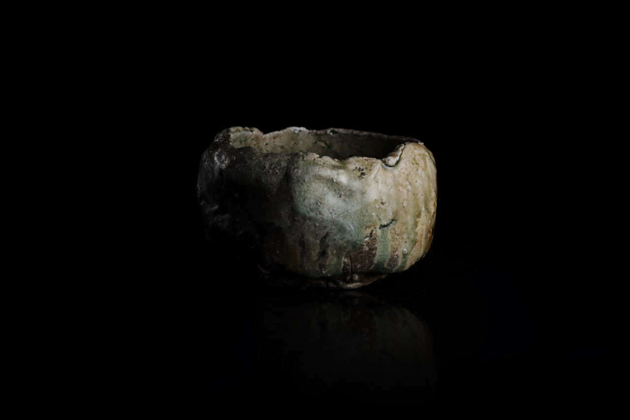 谷本貴の表現は、こうした古伊賀の時代の名品にも通ずるところがある。本作《伊賀茶碗》を手に取れば、まずその大ぶりな姿に驚くことだろう。口部分の大胆なうねりも特徴的で、観る者の関心を引く。一目でその重厚感に圧倒されかねないが、その実、古伊賀の要素を従順に掬い取っており、眺めるほどにますます茶陶としての格をただ静かに湛えた一碗であるように感じてくるから不思議なものだ。見込みを覆う灰被りの黒は、抹茶の色を美しく引き立ててくれるであろうことは想像に難くない。こうした表現は誰にでも可能なものではなく、そこに谷本氏の本質的な個性が存在しているのかもしれないが、ひとしきり眺めてみても、結局のところこの作品の底知れない魅力に圧倒されてしまうのである。