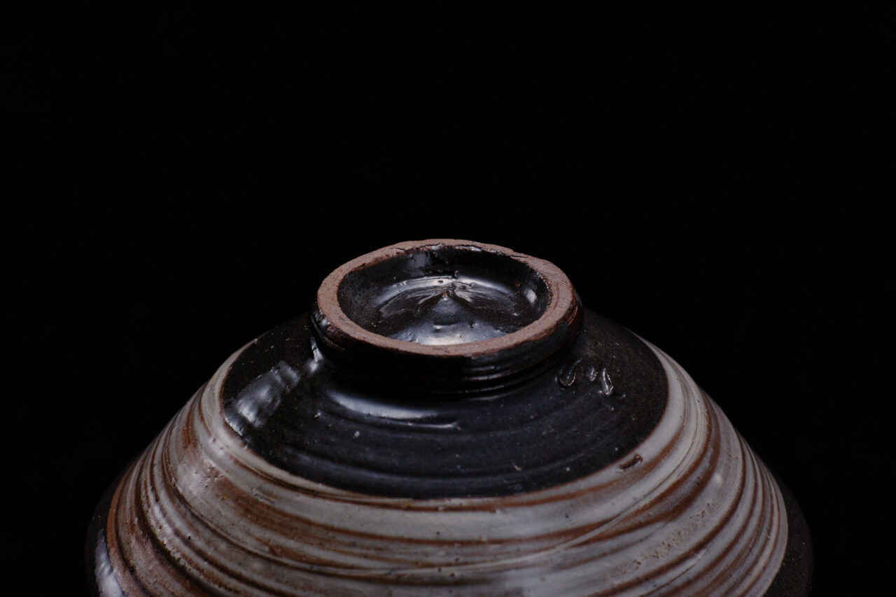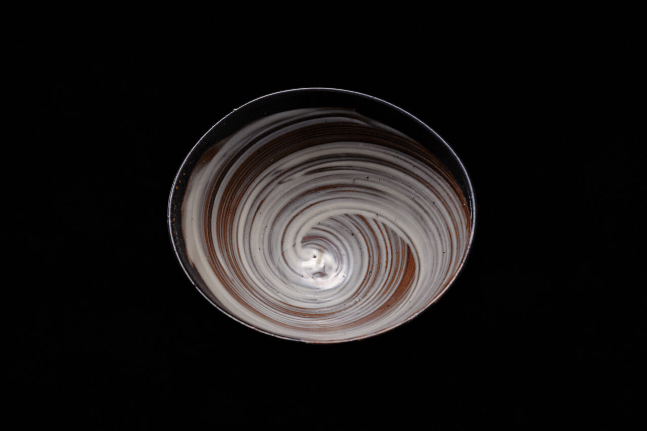 中里隆作《唐津刷毛目茶碗》は、唐津の鉄分を含んだ土から熟練のろくろの技で力強い形を引き出し、藁で作った刷毛で白化粧を施したのち、透明釉をかけて作られている。すんなりと開いた形状の上に伸びやかに線を描く乳白色の刷毛目が、濃い褐色の土肌と相まって醸し出すおおらかな雰囲気は、「何気なくすーっと作っています」と作家が言う通り、余分な力みの無い自然体の魅力を携えている。