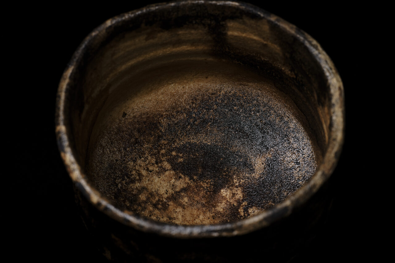近年発表された新作《黒狐手黄瀬戸茶碗》は、黄瀬戸と楽焼の融合を試みる中で生まれた独自の作風だ。作家が目指す黄瀬戸は油揚肌と呼ばれる控えめな照りが特徴の、非常に難易度の高いものだが、本作は油揚げをさらにじっくりと焼いて焦がしたような質感がなんとも味わい深い。碗の内外に滲む黒色は黄瀬戸固有の穏やかな風合いを打ち消すことなく、互いを引き立たせている。